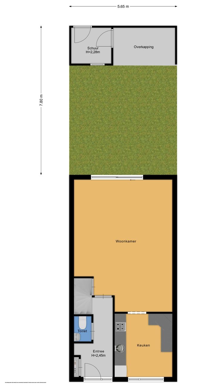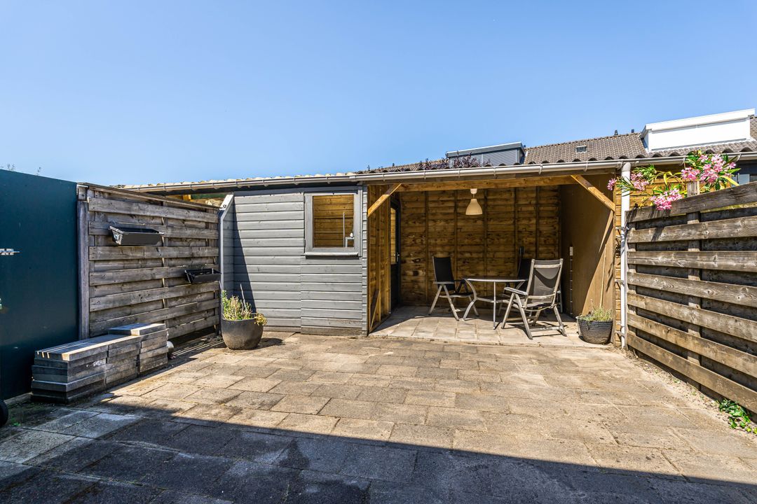 Aan de voorzijde van het huis kijk je uit over het groene hof, oftewel één grote tuin met grasveld en bomen. Aan de achterzijde is naast de bergschuur een overkapping gebouwd, voorzien van lamp en elektra.