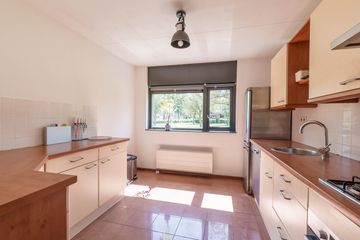 Entree met garderobe en toilet. De uitgebouwde woonkamer oogt nog ruimer door de grote glazen schuifpui. Op de vloer ligt een Zuid-Afrikaanse eiken houten vloer. De half open keuken is voorzien van inbouwapparatuur. Veel werkruimte om de maaltijden te bereiden op de twee aanrechtbladen aan beide zijden van de keuken en genoeg kastruimte.