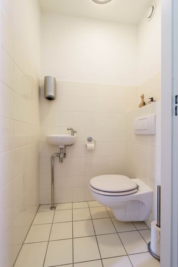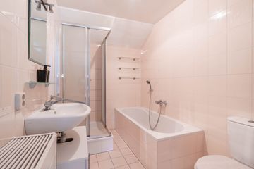 De badkamer is voorzien van een ligbad, een aparte douchecabine, een wastafel en toilet.