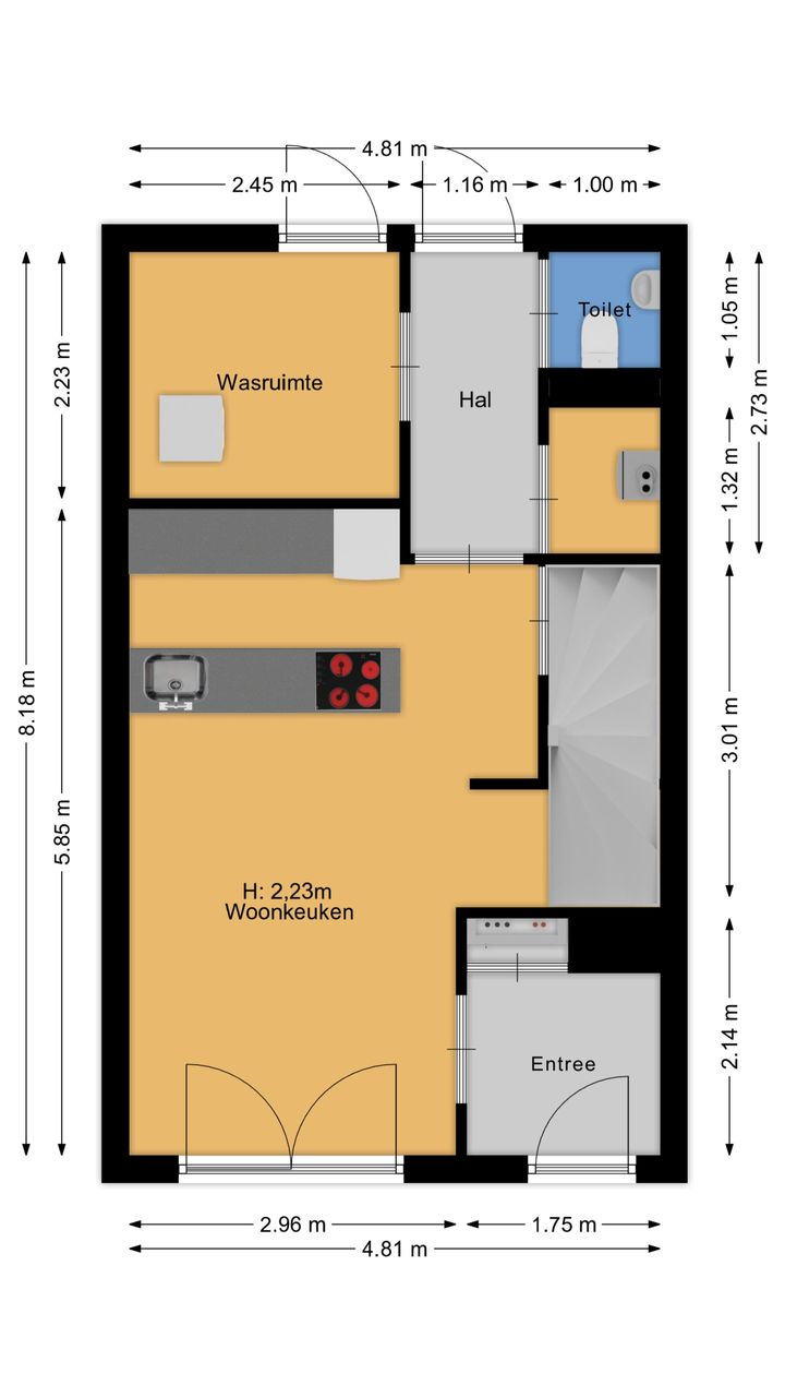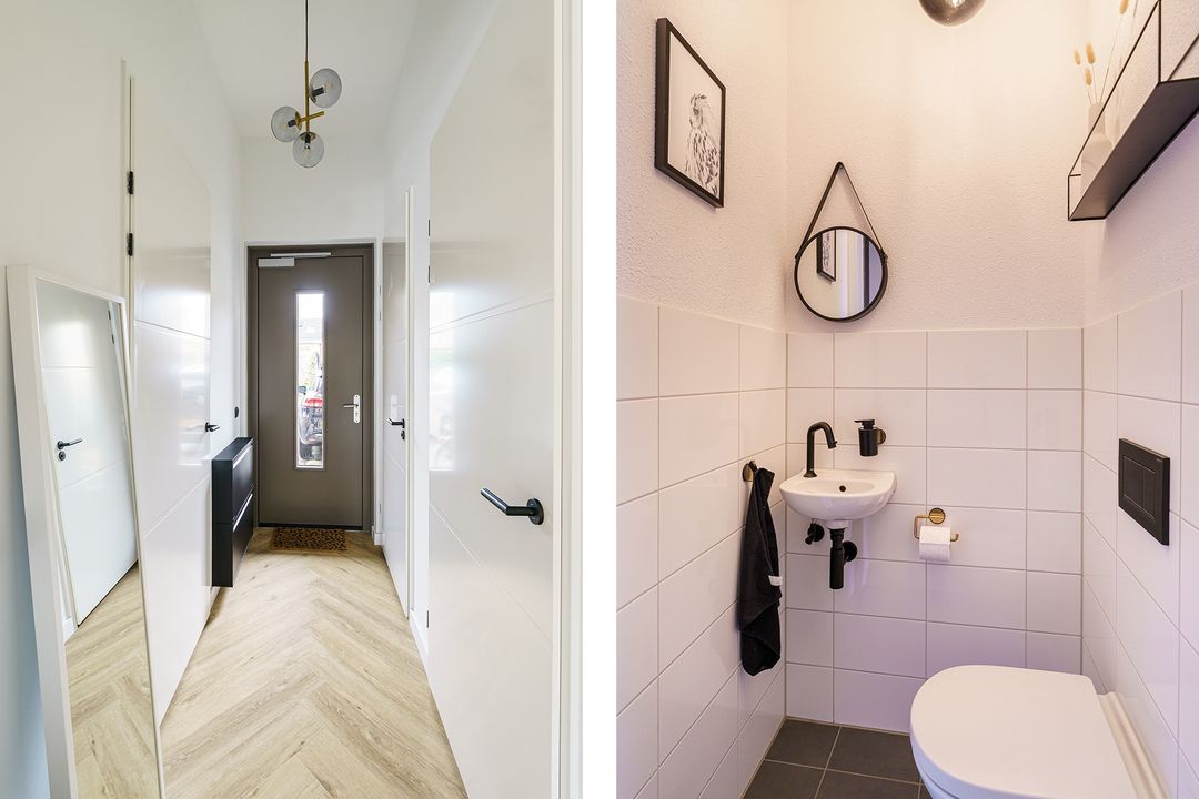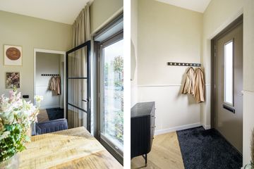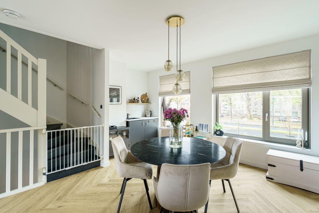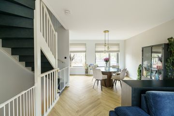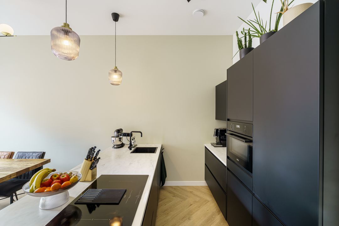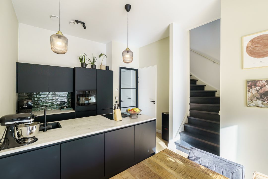 Je komt binnen via de voortuin in de hal, met toegang tot de gezellige woonkeuken. De keuken heeft een praktische parallelopstelling en is van alle gemakken voorzien: een kookplaat met afzuiging, (combi)magnetron, oven, Quooker, vaatwasser, koelkast en vriezer. Dankzij de dubbele openslaande deuren valt er veel licht naar binnen en loop je zo naar buiten. En handig: onder de trap is extra bergruimte.