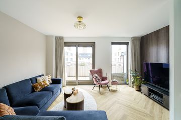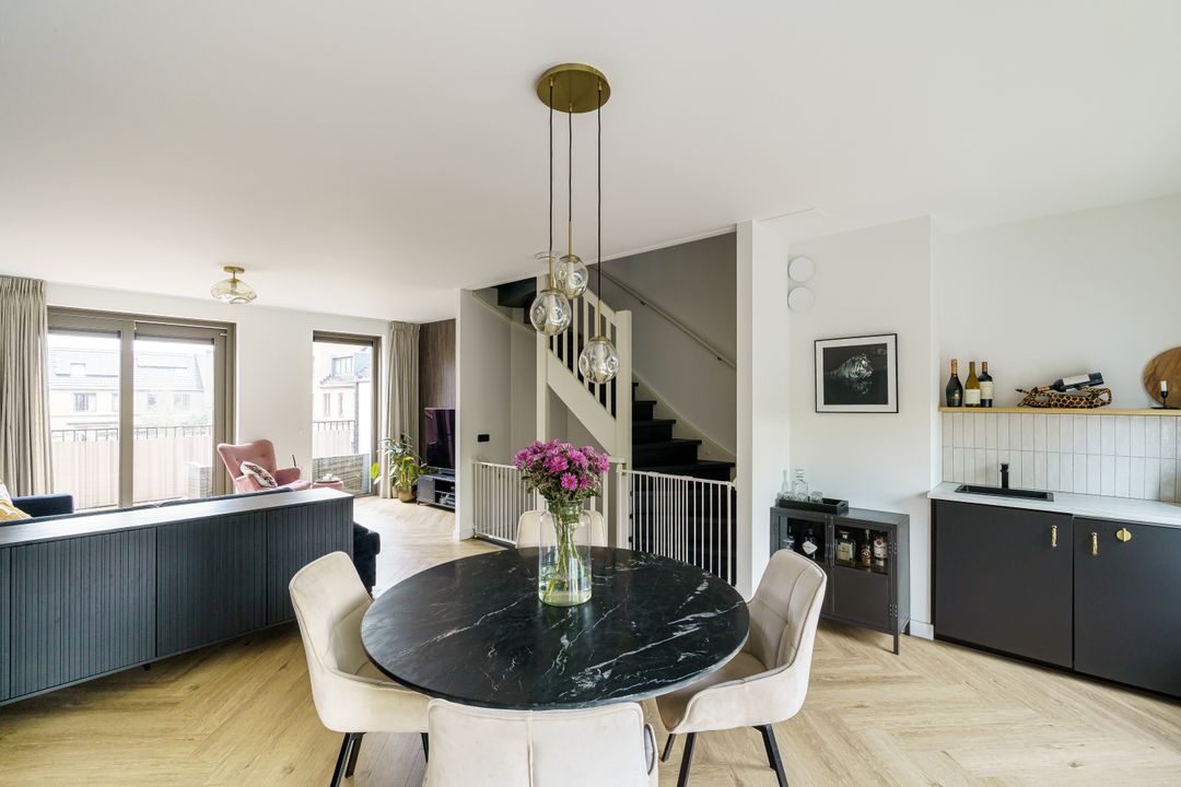 Op de eerste verdieping vind je de ruime woonkamer met een kleine pantry en toegang tot het balkon van ruim 10 m² met houten vlonders. Een fijne plek om te relaxen of gezellig met vrienden te borrelen.