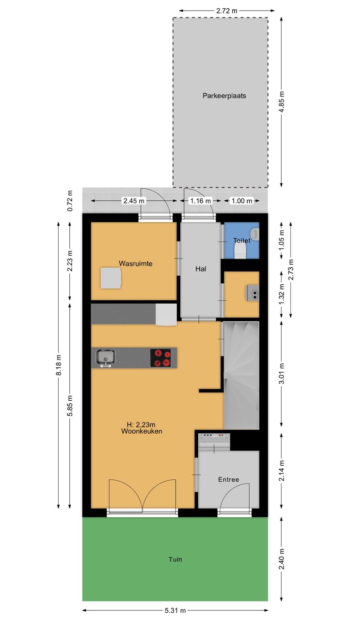 Via de tussenhal bereik je het toilet, een kast met de C.V.-installatie en een aparte wasruimte/berging. Vanuit zowel de hal als de wasruimte loop je door naar de achterzijde van de woning, waar je eigen parkeerplaats op het binnenterrein is, dus altijd plek voor de auto.