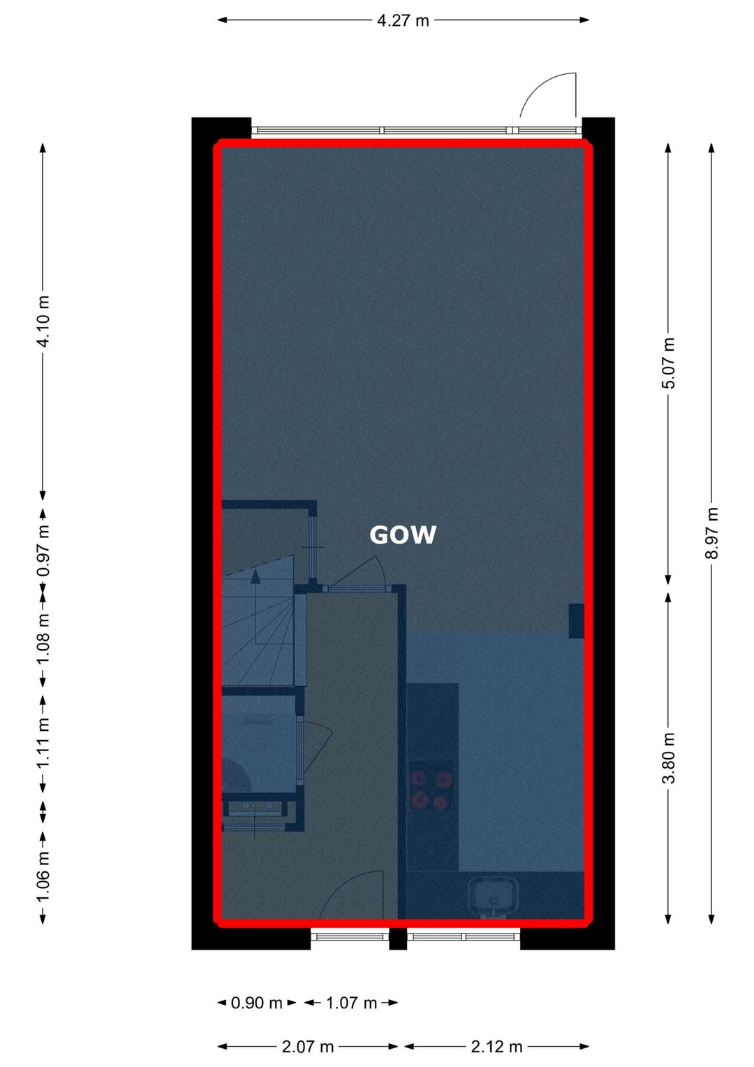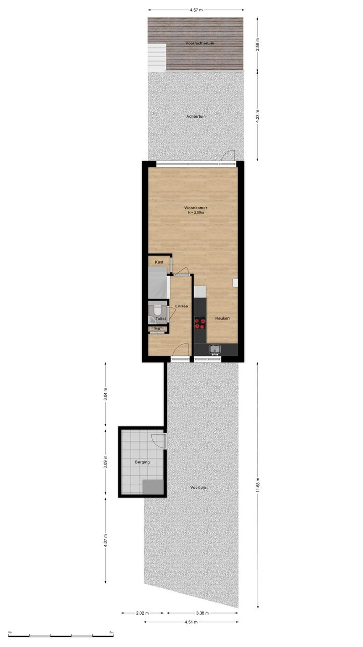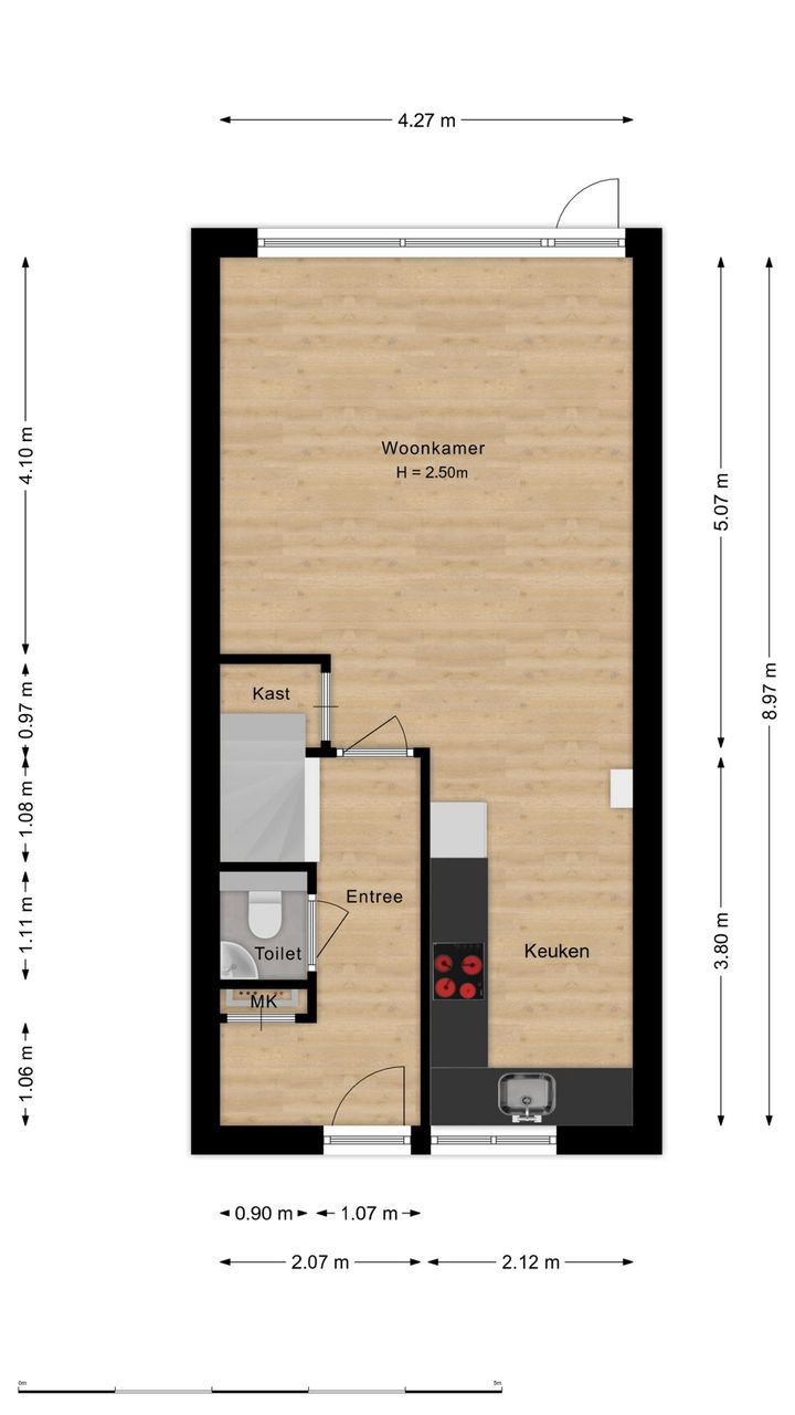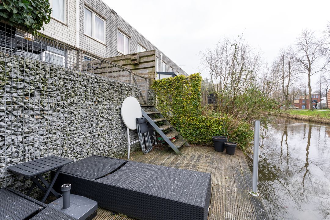 Via de eigen oprit komt u bij de voordeur met daarachter de hal die toegang geeft tot de woonkamer, het toilet, de meterkast en de dichte trap naar de eerste verdieping. Binnen in de woonkamer zult u verrast worden door de moderne afwerking en de gezellige sfeer. De woonkamer is licht en staat in verbinding met de open keuken, deze is voorzien van alle benodigde apparatuur en biedt voldoende ruimte om lekker te koken. Via de achterdeur komt u in de zonnige achtertuin die op het zuidwesten ligt. Aan het water is een gezellig terras aangelegd waar u heerlijk kunt genieten van een kop koffie of een lekker glas wijn. Aan de voorzijde van de woning bevindt zich een gemetselde schuur die genoeg ruimte biedt voor enkele fietsen.
