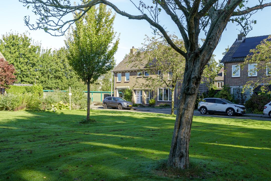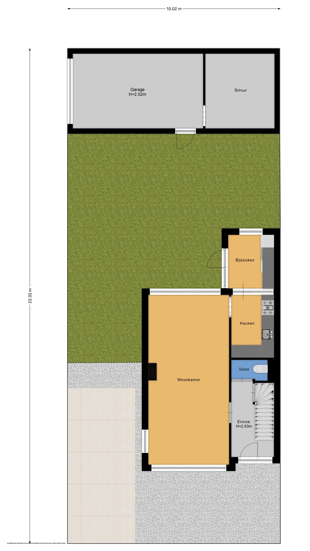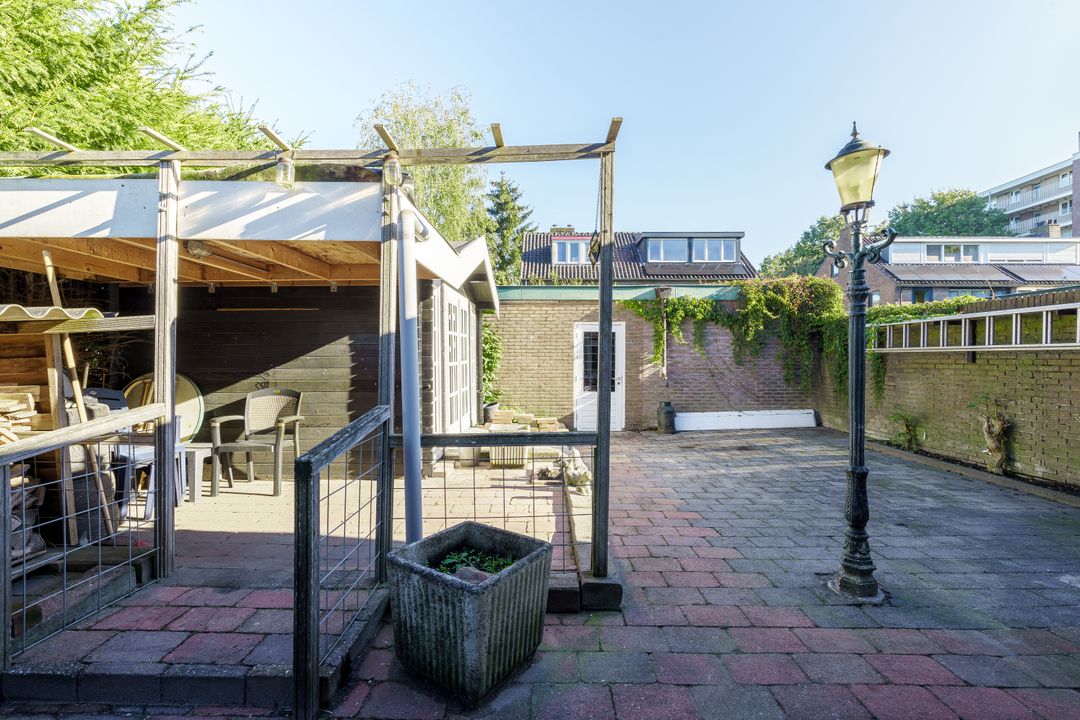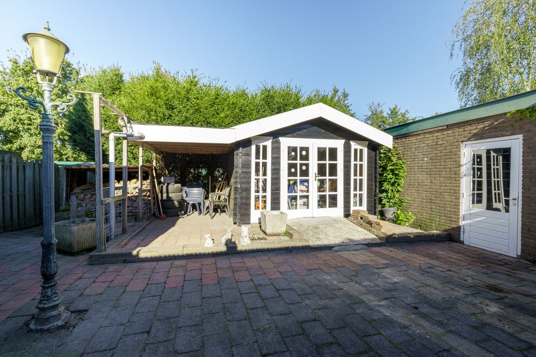 In de voortuin een oprit voor de auto. In de achtertuin is een veranda annex schuur gebouwd. Achterin de tuin een loopdeur voor de garage. De garage zelf is in te rijden via het naastgelegen plein.
