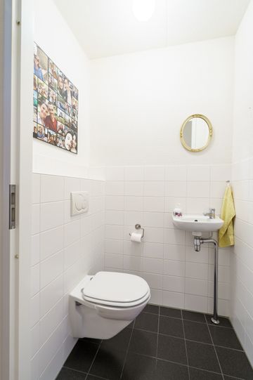 Tweede verdieping: de entree leidt naar een ruime hal met een apart toilet en fonteintje. De woonkamer heeft veel lichtinval en een erg mooi uitzicht.