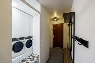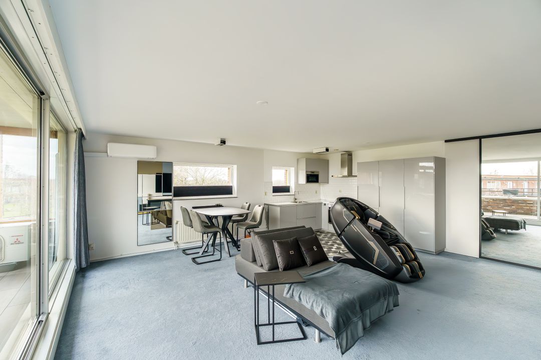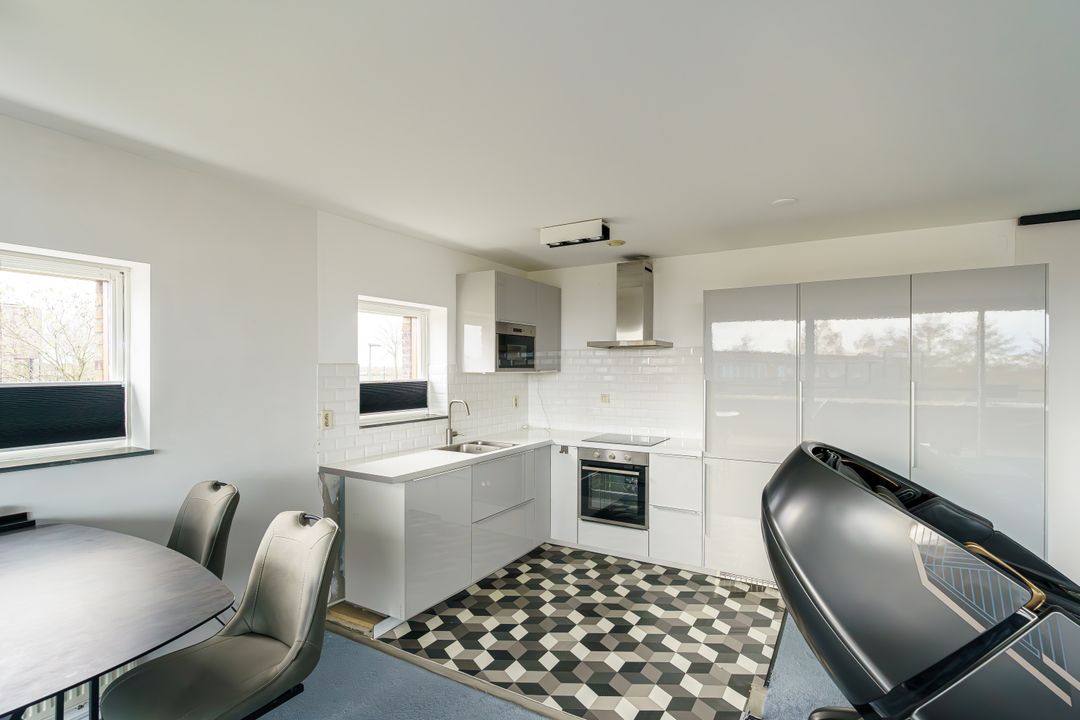 De woonkamer is opvallend licht dankzij de hoekligging met een extra raam en de grote glazen pui naar het balkon met vrij uitzicht, wat zorgt voor een heerlijk ruimtelijk gevoel. Aansluitend is de modern afgewerkte open keuken, compleet uitgerust met alle inbouwapparatuur zoals een kookplaat, afzuigkap, oven, magnetron, koelkast, vriezer en vaatwasser.