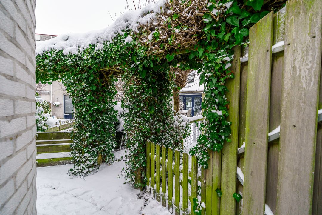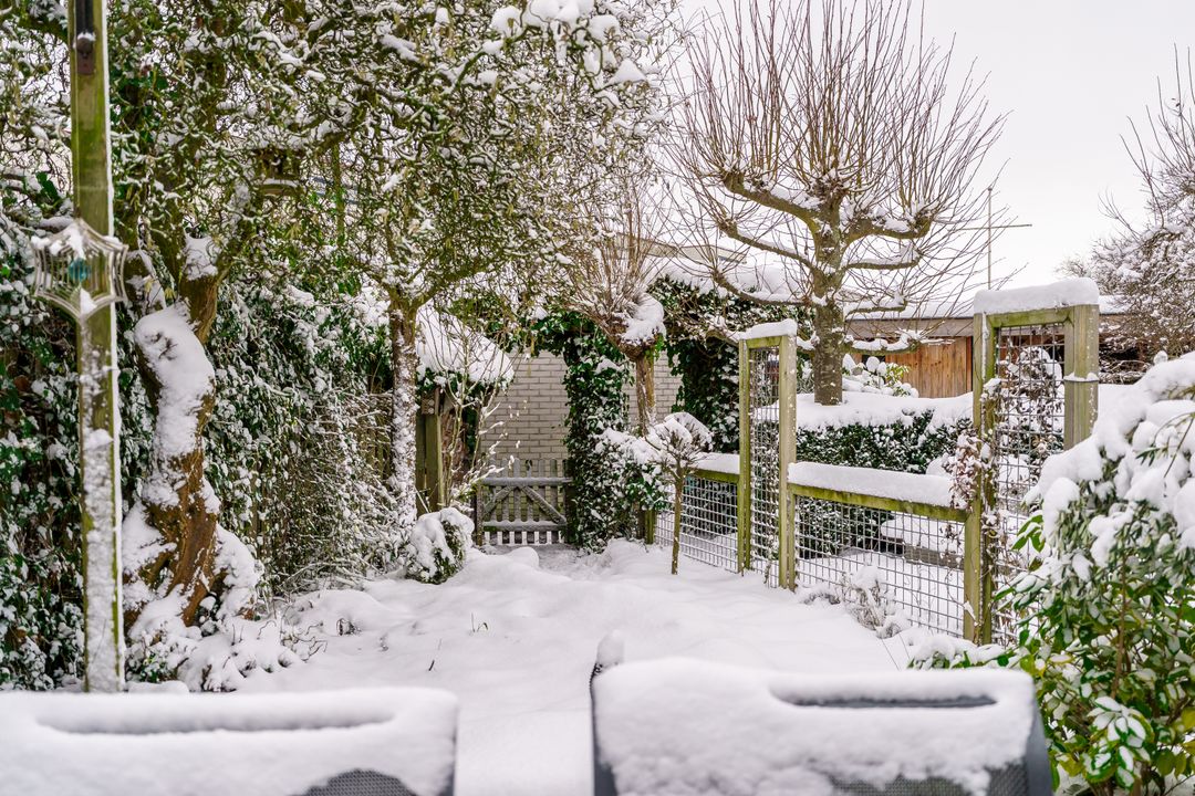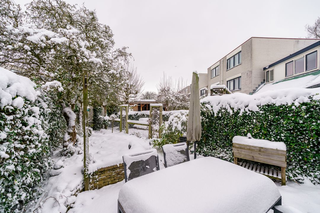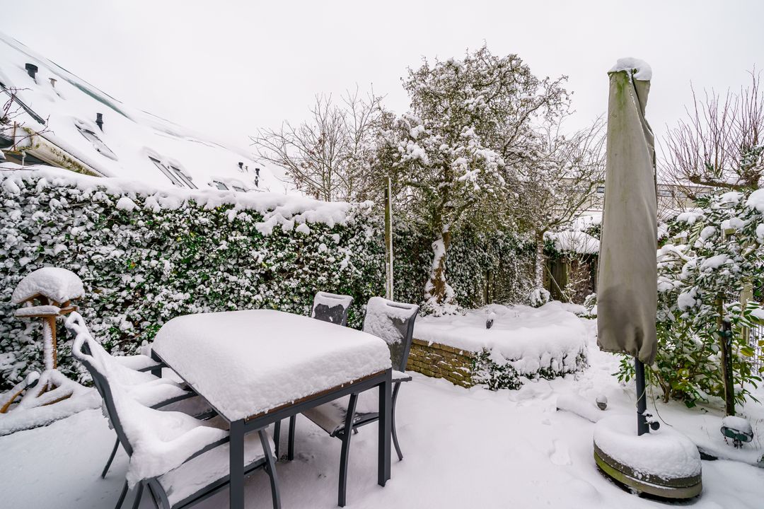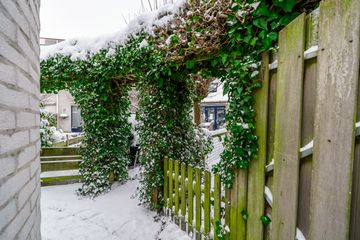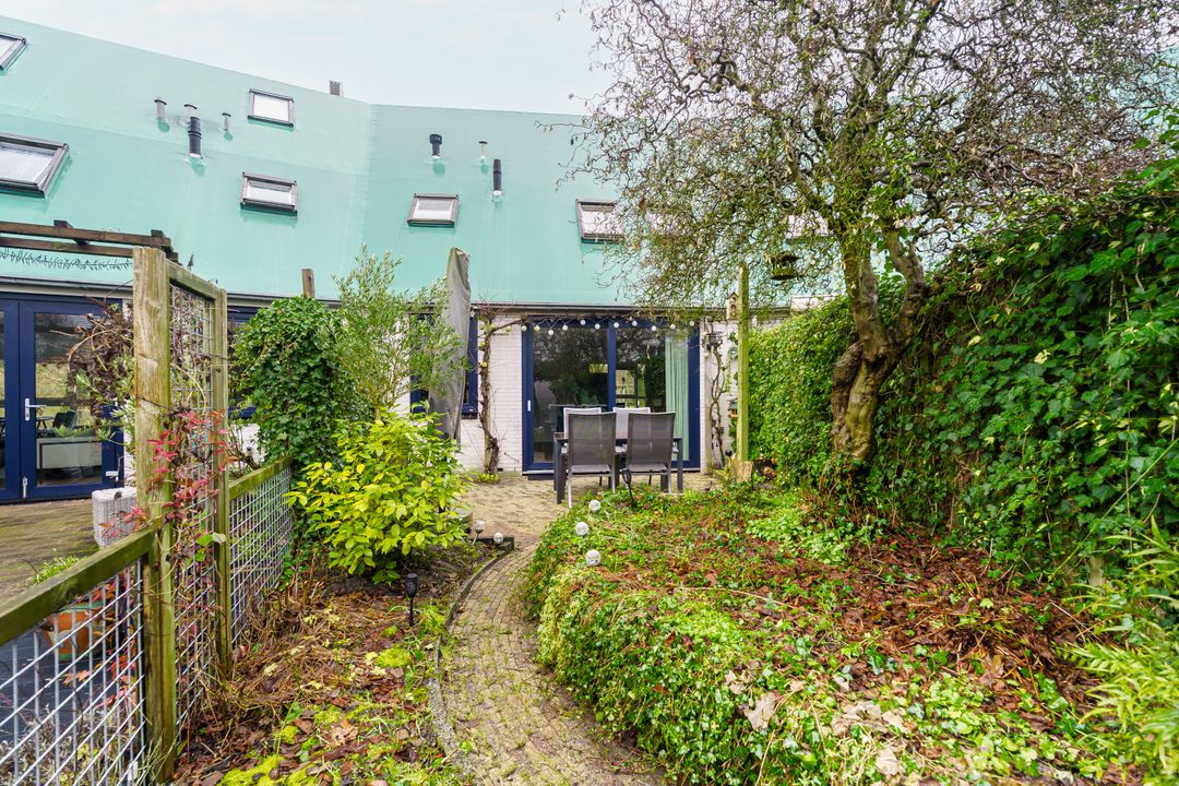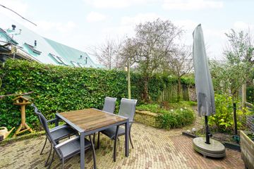 Via de schuifpui in de woonkamer bereik je de diepe, groene tuin met groenblijvers, borders met bloeiende planten en volwassen bomen; een fijne plek voor rust, vogels en buitenleven, met daarnaast een zonnig terras. Achter de tuin, bereikbaar via een achterom, is een (fietsen)schuur van circa 6 m² op het gezamenlijke binnenplein.