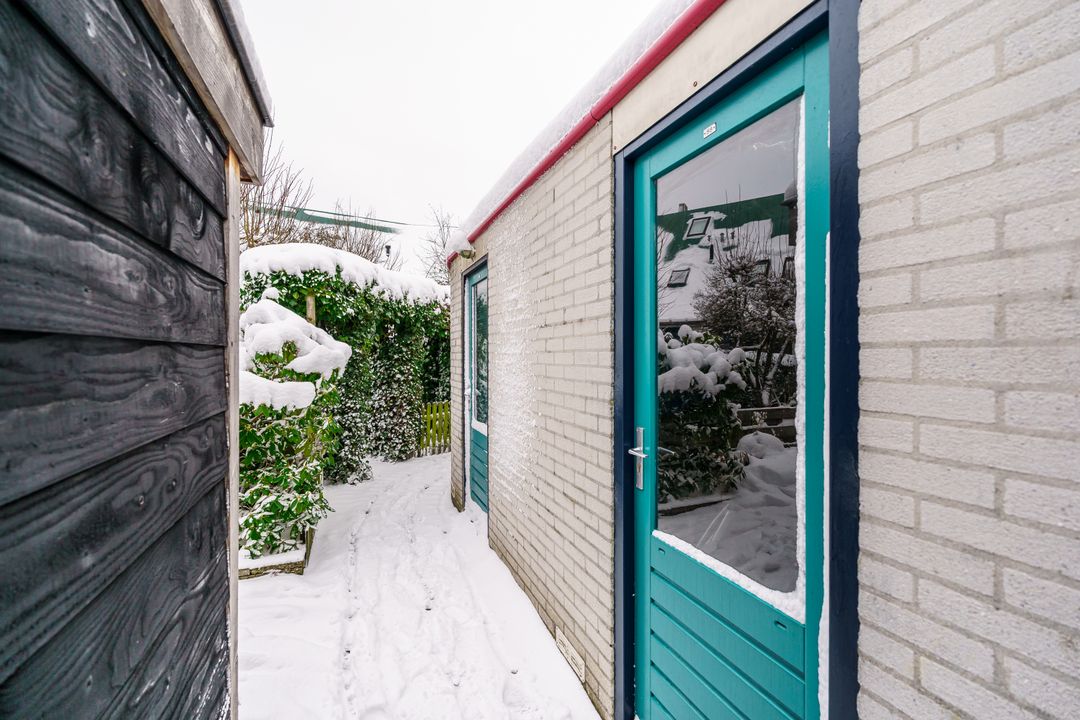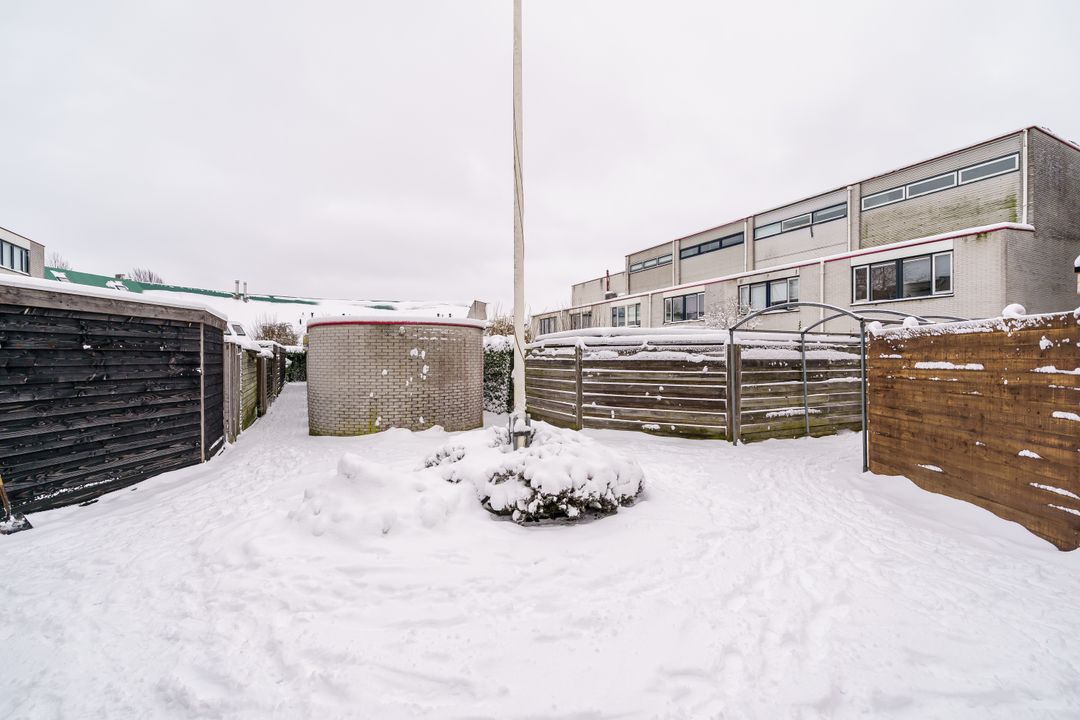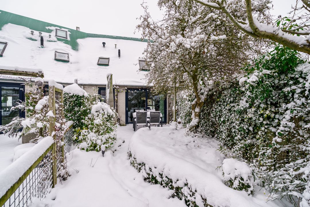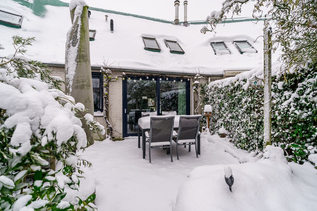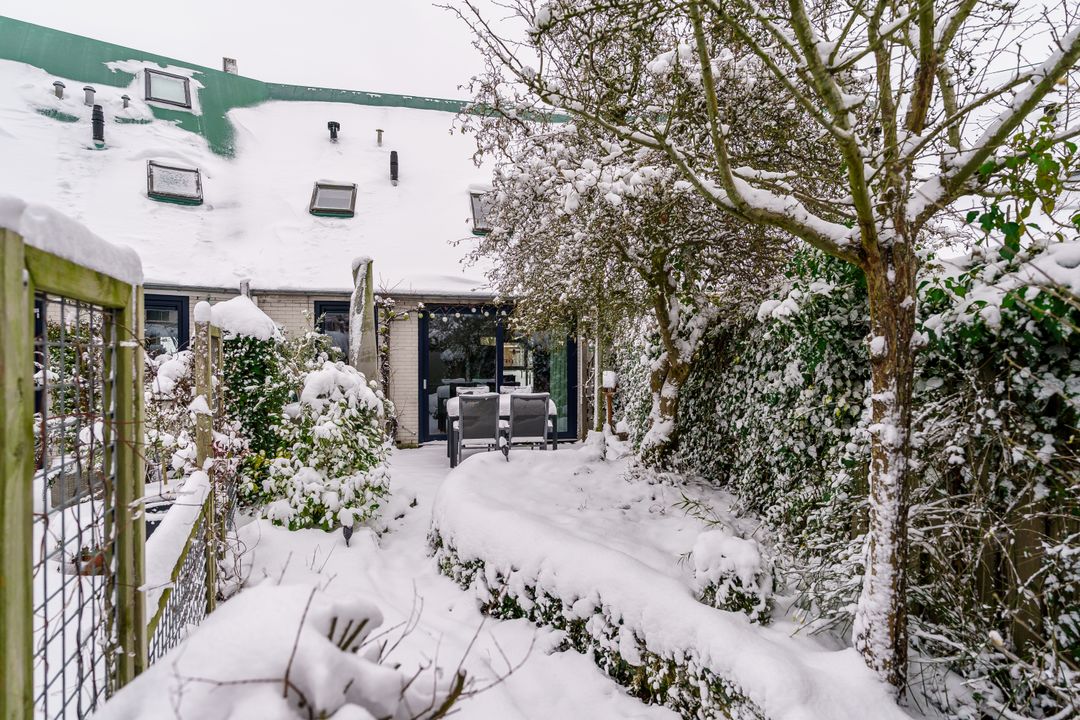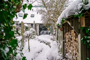 Via de schuifpui in de woonkamer bereik je de diepe, groene tuin met groenblijvers, borders met bloeiende planten en volwassen bomen; een fijne plek voor rust, vogels en buitenleven, met daarnaast een zonnig terras. Achter de tuin, bereikbaar via een achterom, is een (fietsen)schuur van circa 6 m² op het gezamenlijke binnenplein.