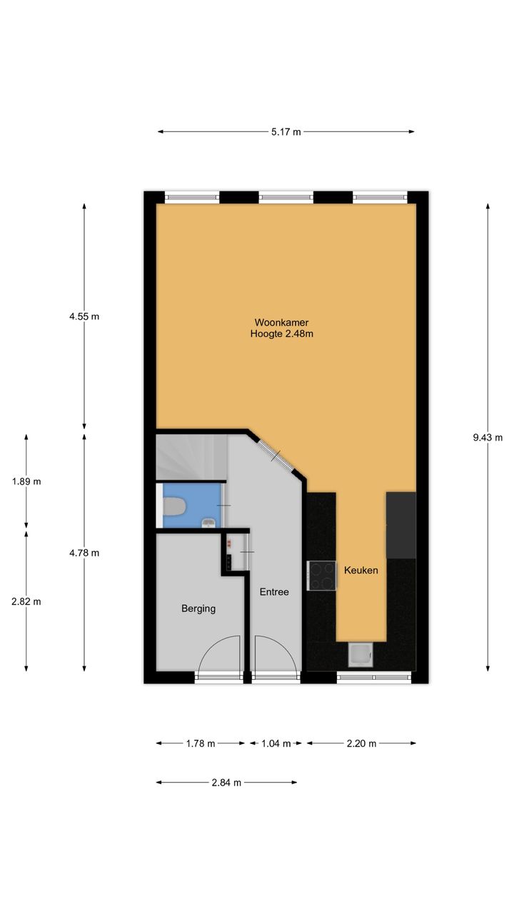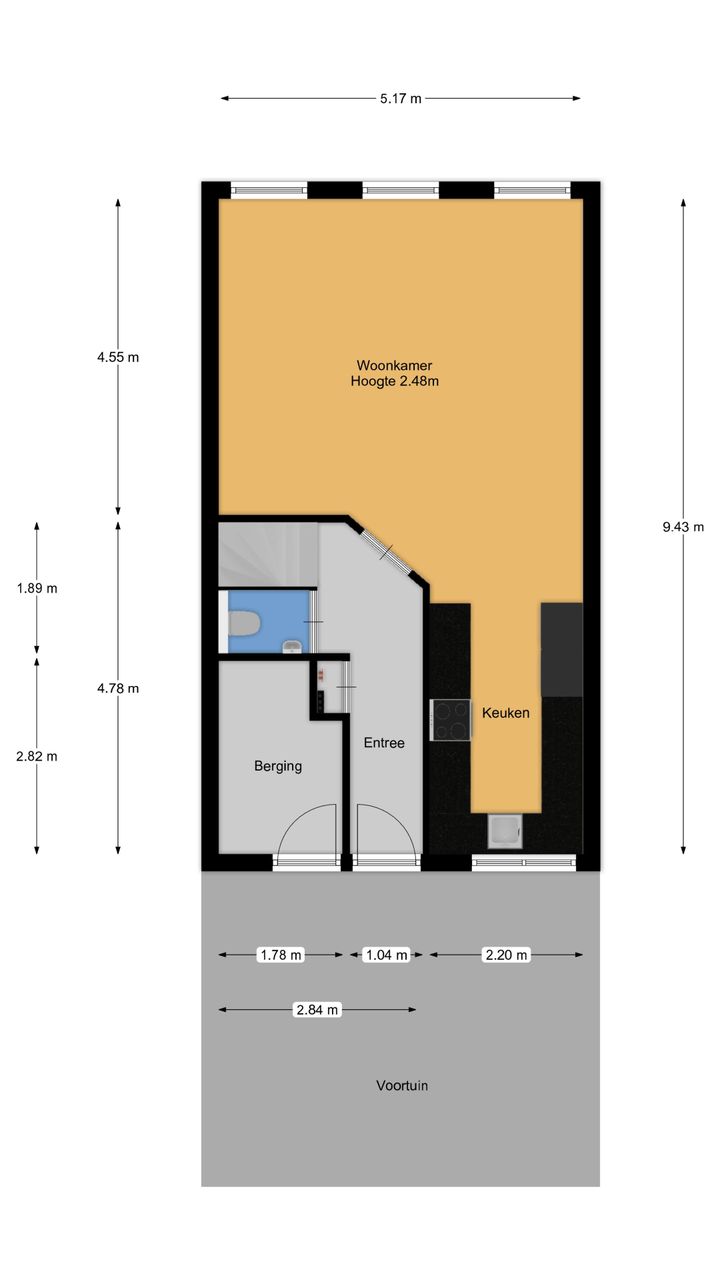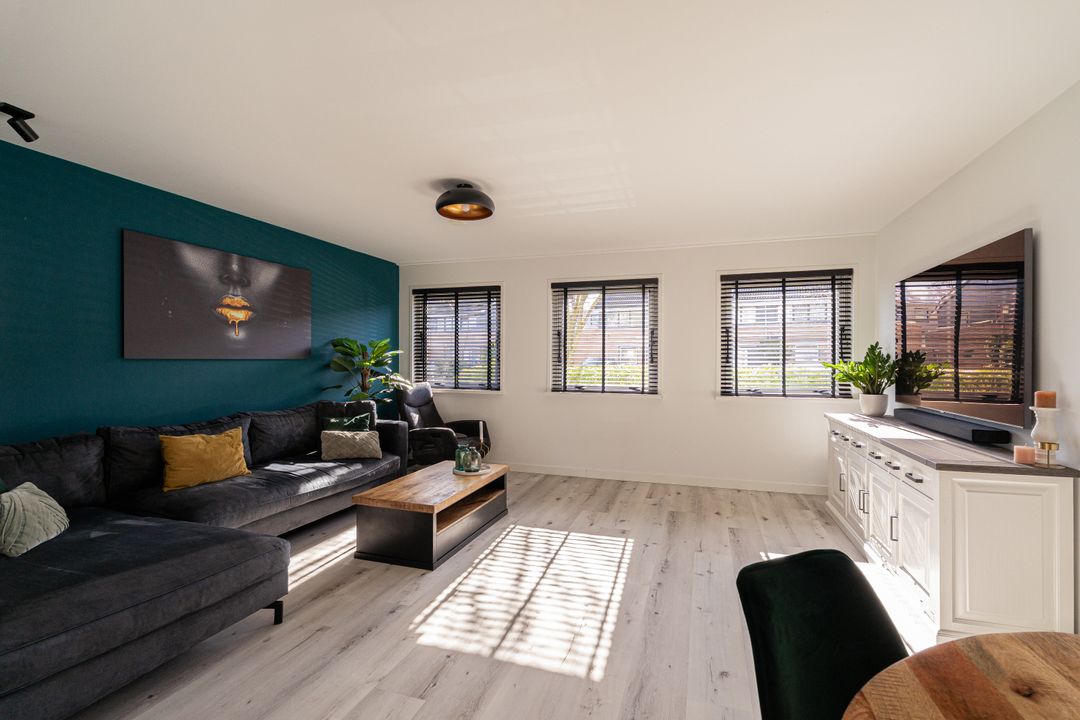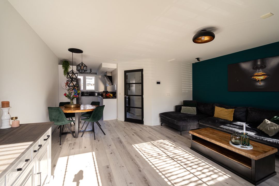 Via de beschutte voortuin kom je in de hal met meterkast, toilet en trapopgang. De lichte en ruime woonkamer vormt een fijne leefruimte voor het hele gezin. Aan de voorzijde is de keuken in U-opstelling, voorzien van alle gemakken zoals een inductiekookplaat, afzuigkap, vaatwasser, oven en Quooker. Vanuit hier heb je een prettig uitzicht op de kinderen in de speeltuin. Naast de entree bevindt zich bovendien een praktische (fietsen)berging van circa 4,6 m².