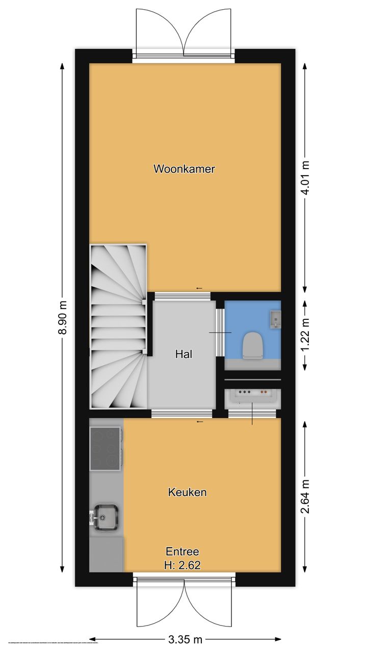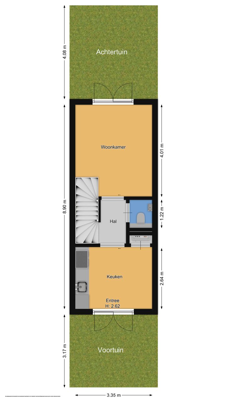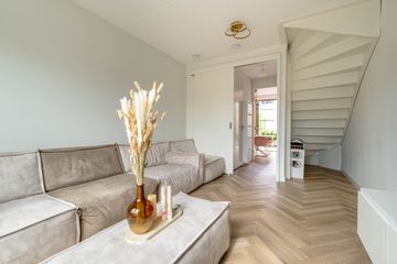 Via de voortuin en twee grote openslaande deuren kom je in de gezellige keuken. Deze is voorzien van moderne inbouwapparatuur. Achterin de woning is de woonkamer gesitueerd en ook deze ruimte is voorzien van twee grote openslaande deuren die toegang geven tot de zonnige achtertuin. De woonkamer en keuken zijn beide voorzien van een mooie PVC vloer met daaronder een vloerverwarming die je in de zomer de woning kan laten koelen. Woonkamer en keuken zijn verbonden door een hal met toegang tot het toilet en de trap naar de 1e verdieping.