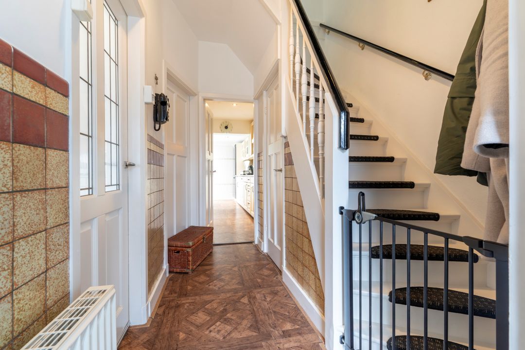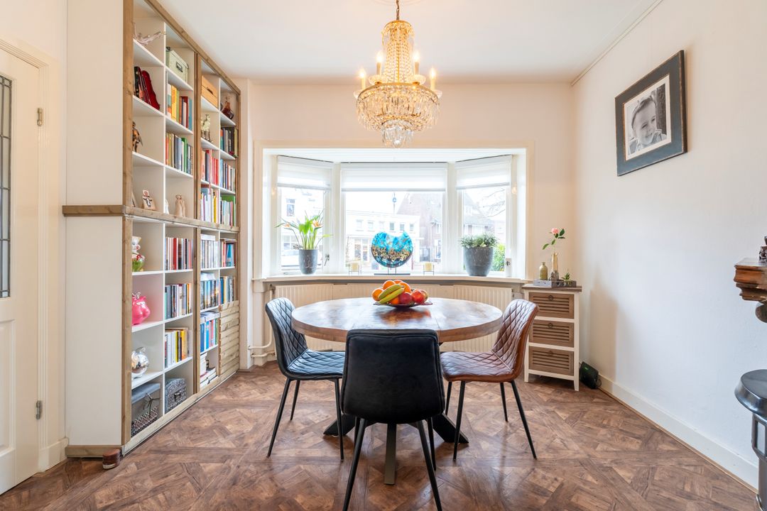 Via de ruime voortuin kom je bij de voordeur met daarachter de hal die toegang geeft tot het toilet, de woon/eetkamer, de keuken, de kelderkast en de dichte trap naar boven. Zeer sfeervolle en lichte (woon/eet) kamer-en-suite met schuifdeuren, twee schouwen met haard, hoog plafond, glas-in-lood, erker en een aangebouwde serre aan de achterzijde. Deze serre is via de keuken of via een schuifdeur vanuit de woonkamer te betreden. De serre heeft twee openslaande deuren richting de achtertuin. Onder de trap in de hal bevindt zich een kelderkast, handig om als voorraadkast te gebruiken en je stofzuiger op te bergen. De dichte keuken biedt met zijn vijf meter diepte genoeg ruimte om lekker te kokkerellen.