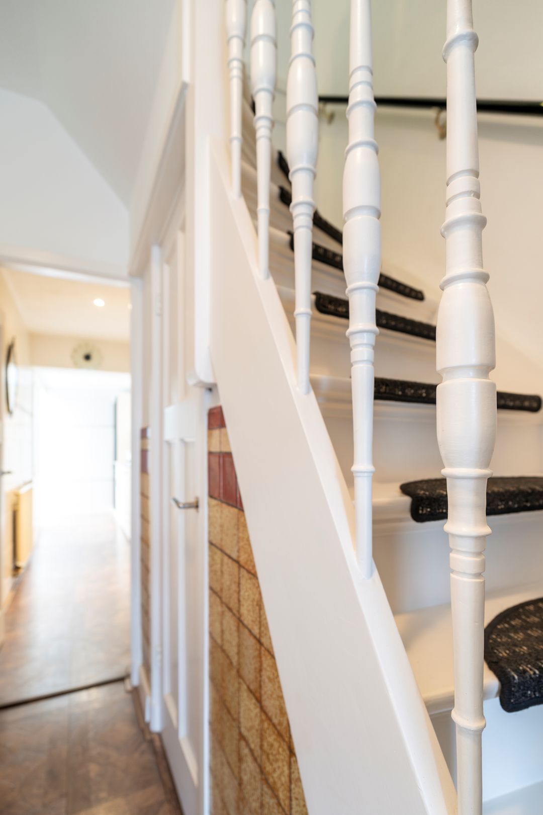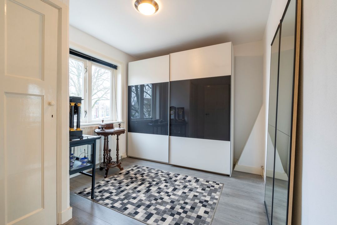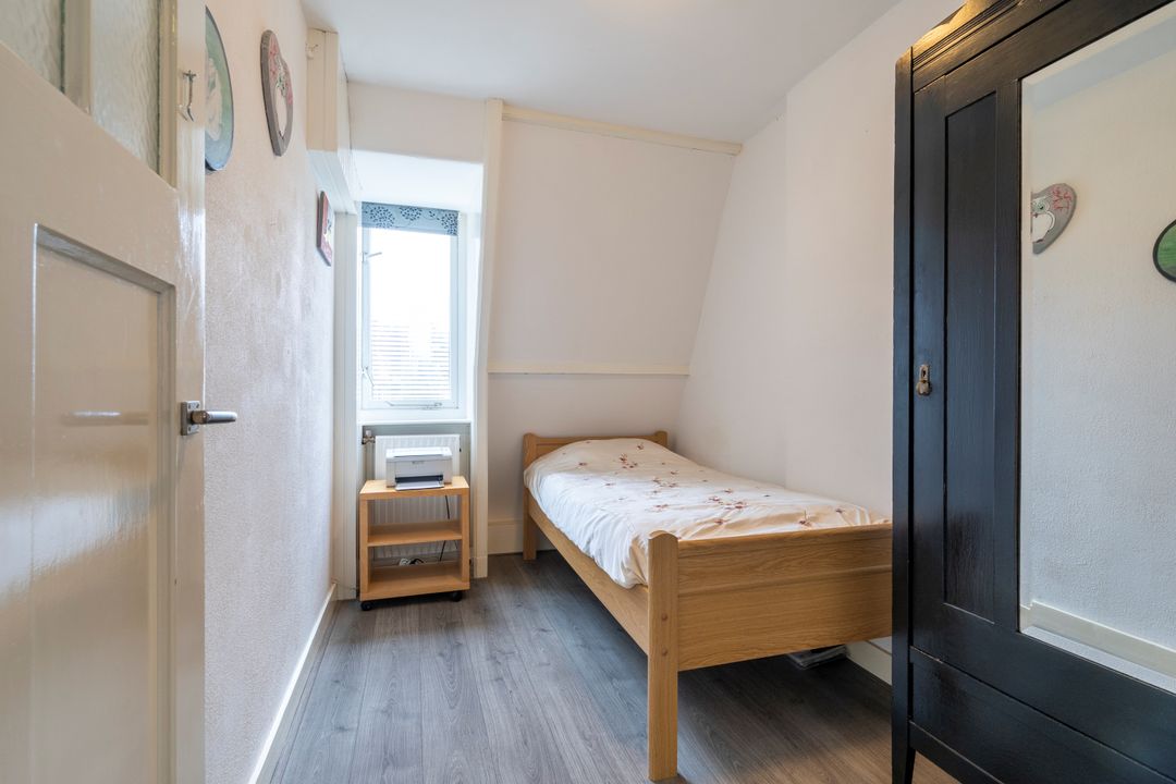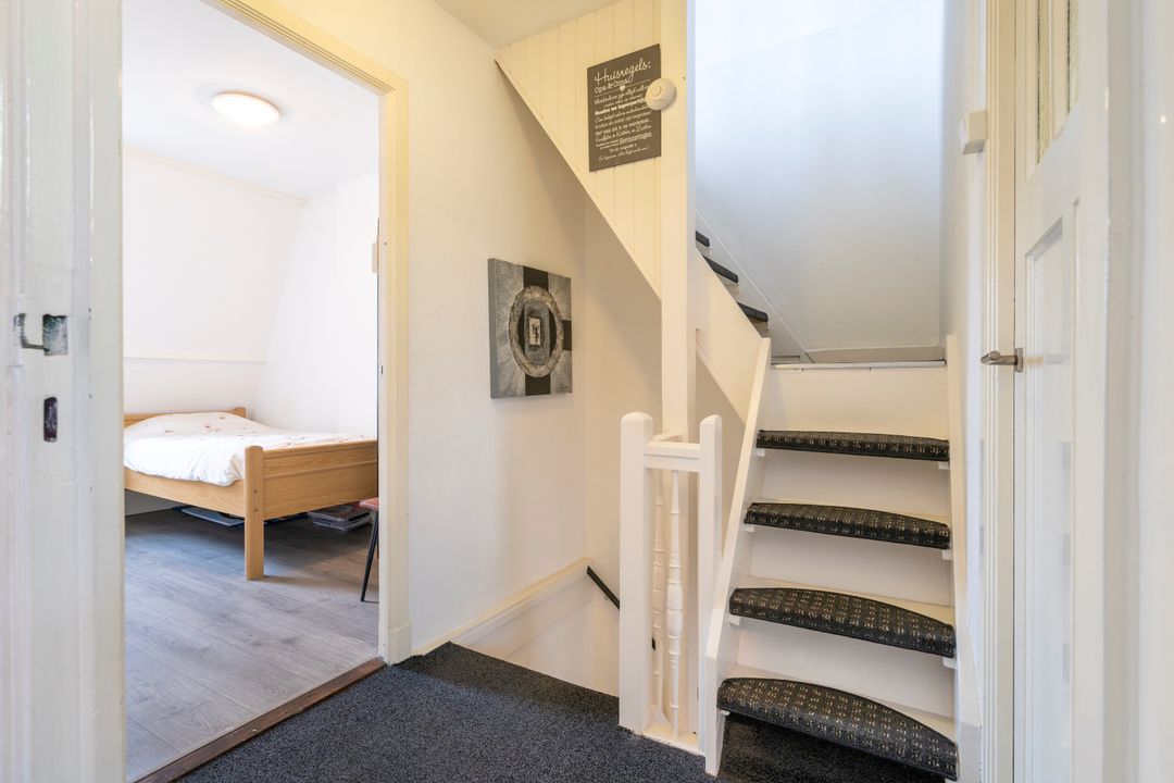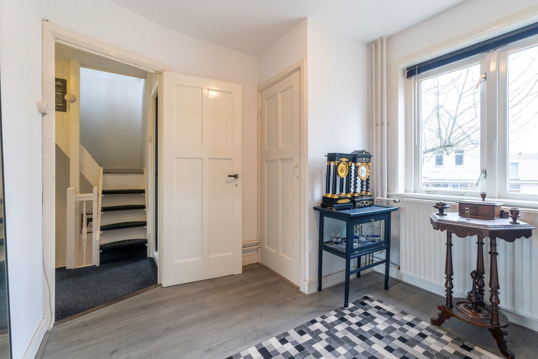 Via de trap met authentieke details kom je op de overloop van de eerste verdieping. Hier bevinden zich drie slaapkamers en de badkamer. Aan de achterzijde is een dakkapel geplaatst waardoor er extra leefruimte is gecreƫerd. De twee grootste slaapkamers hebben een inbouwkast. De badkamer is voorzien een douche en badkamermeubel.