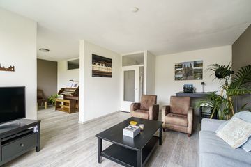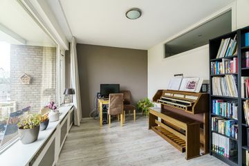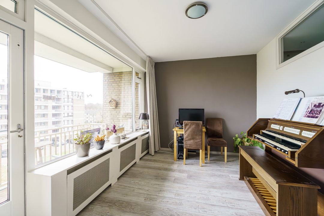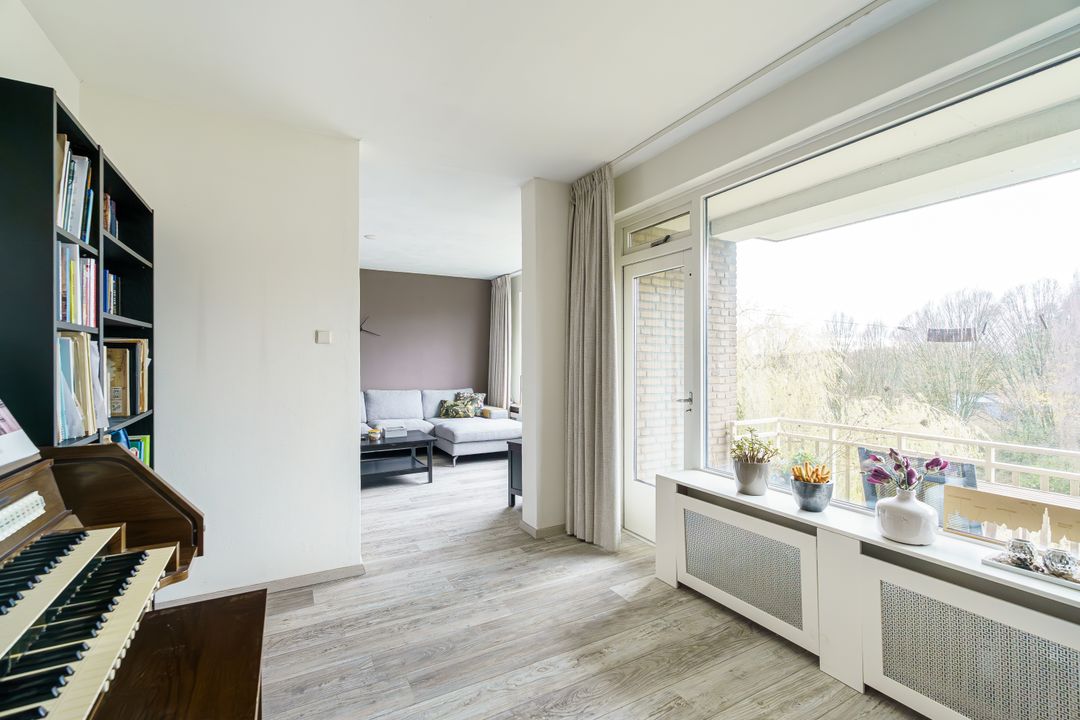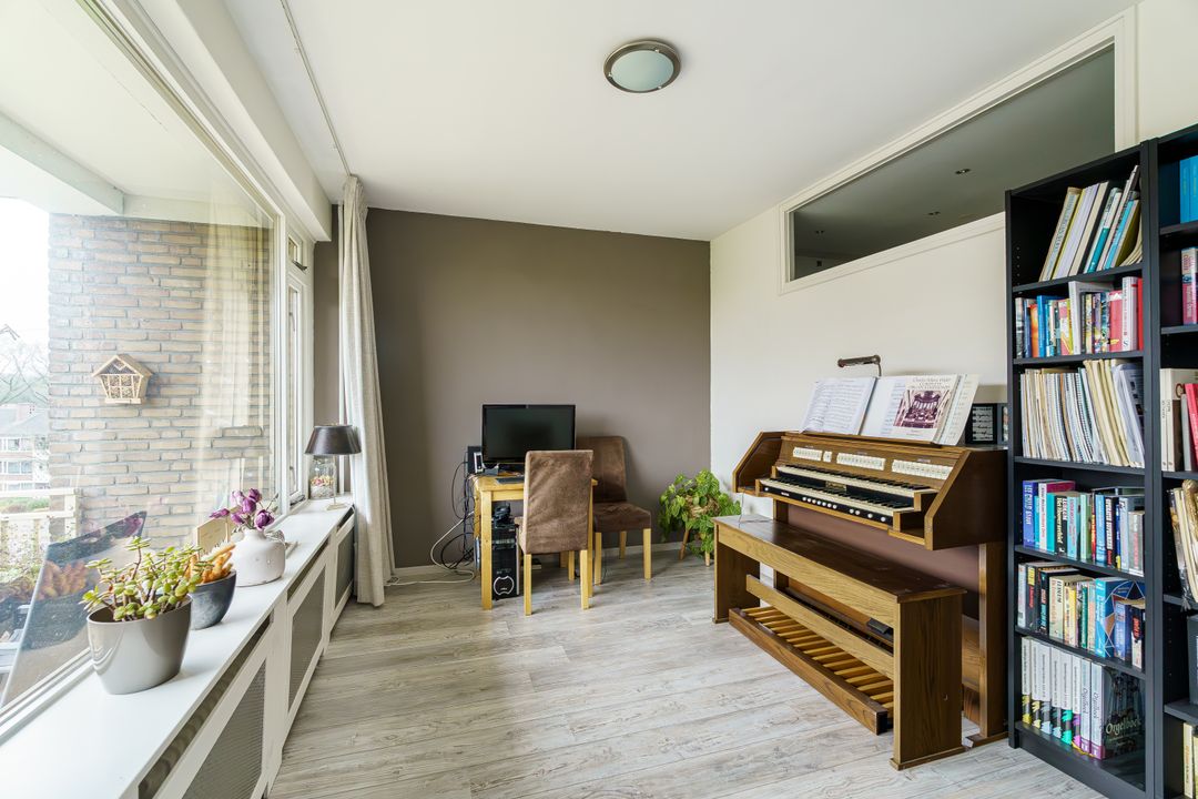 Via de entree kom je in de hal, die toegang geeft tot alle ruimtes. De woonkamer ligt aan de achterzijde en voelt door het vrije uitzicht direct ruim en licht aan. Via een open doorgang bereik je de zijkamer, nu ingericht als werk- en muziekkamer, ideaal voor thuiswerken, eetkamer of hobby’s, en bovendien met toegang tot het zonnige balkon.