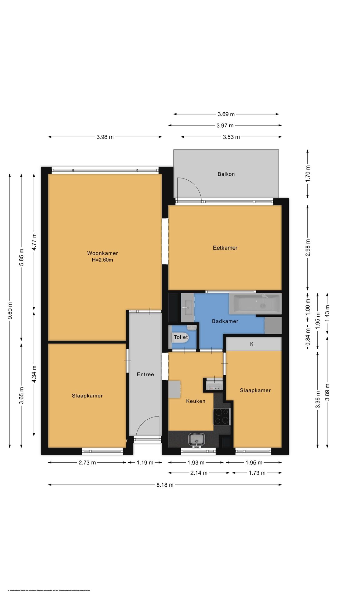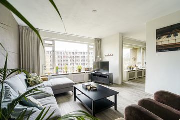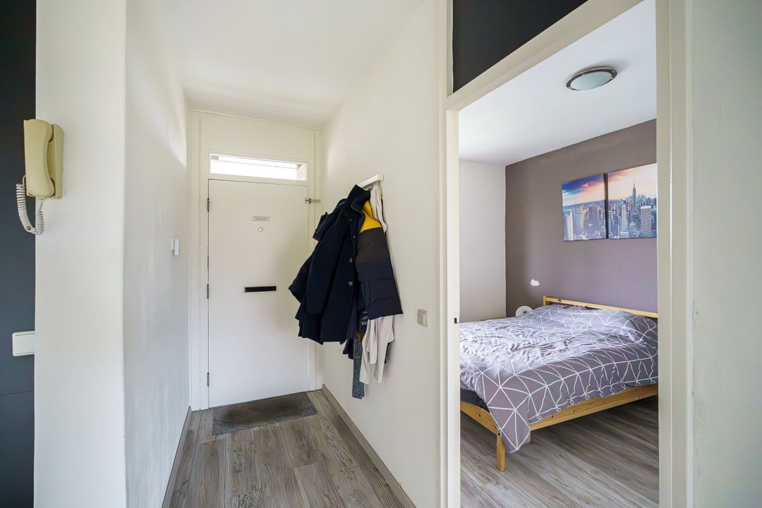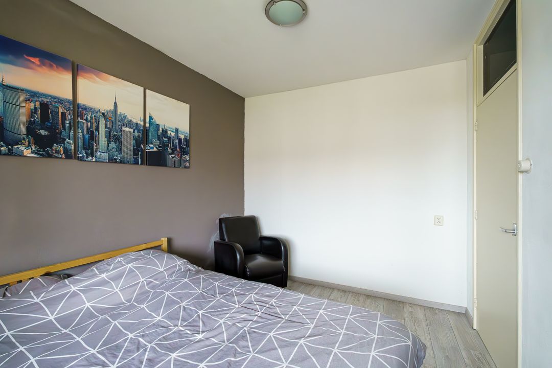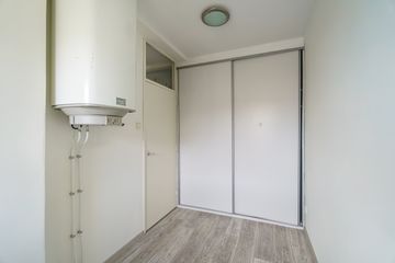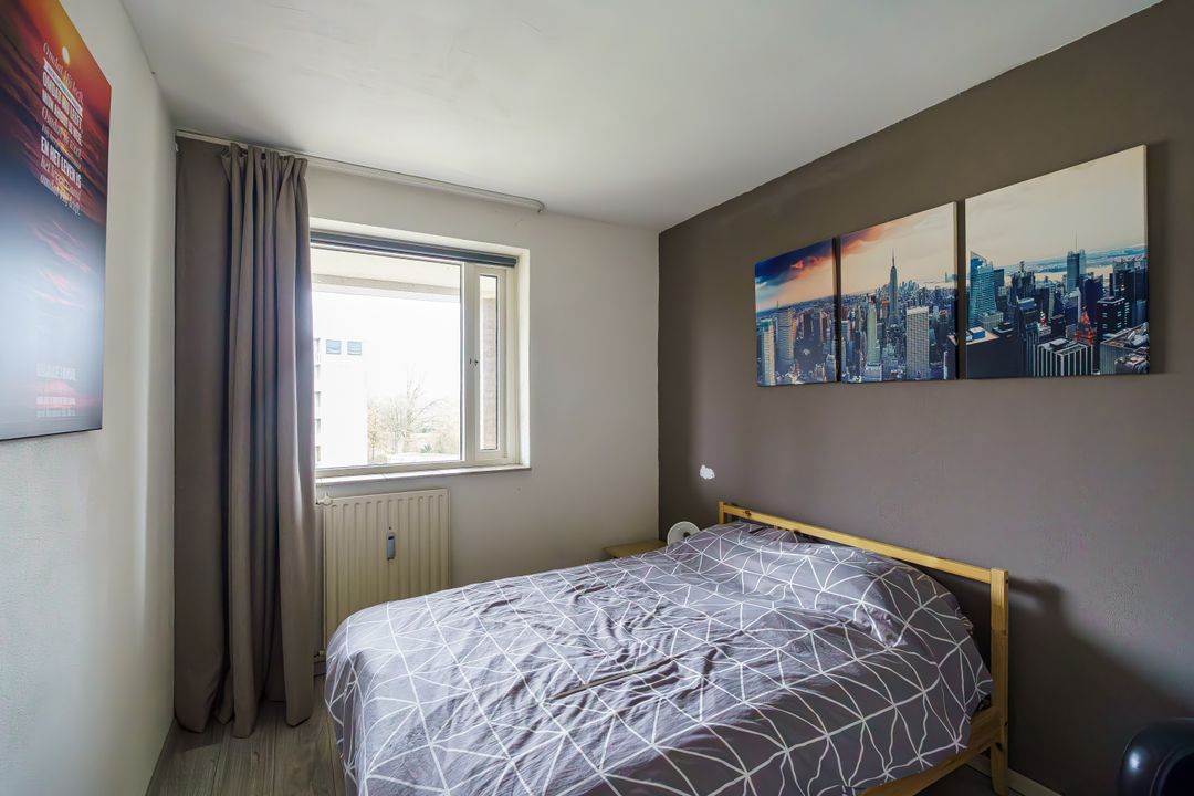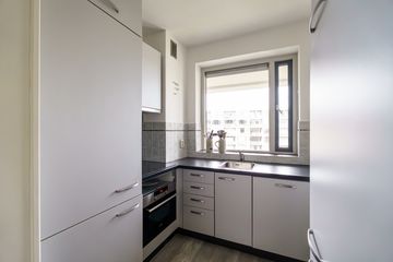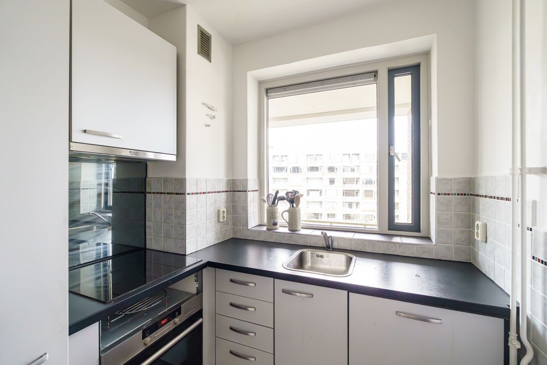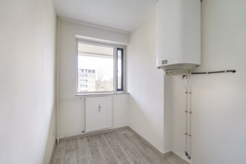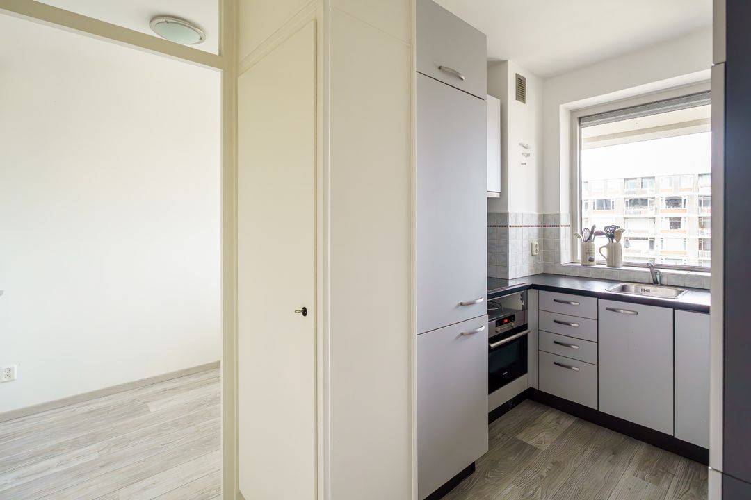 De keuken ligt aan de galerijzijde en is compact maar slim ingedeeld. Je vindt er alles wat je nodig hebt: een vaatwasser, koelkast, vriezer, kookplaat en afzuigkap. Vanuit de hal bereik je de grote slaapkamer en via de keuken kom je in een tweede (slaap)kamer met vaste kast.