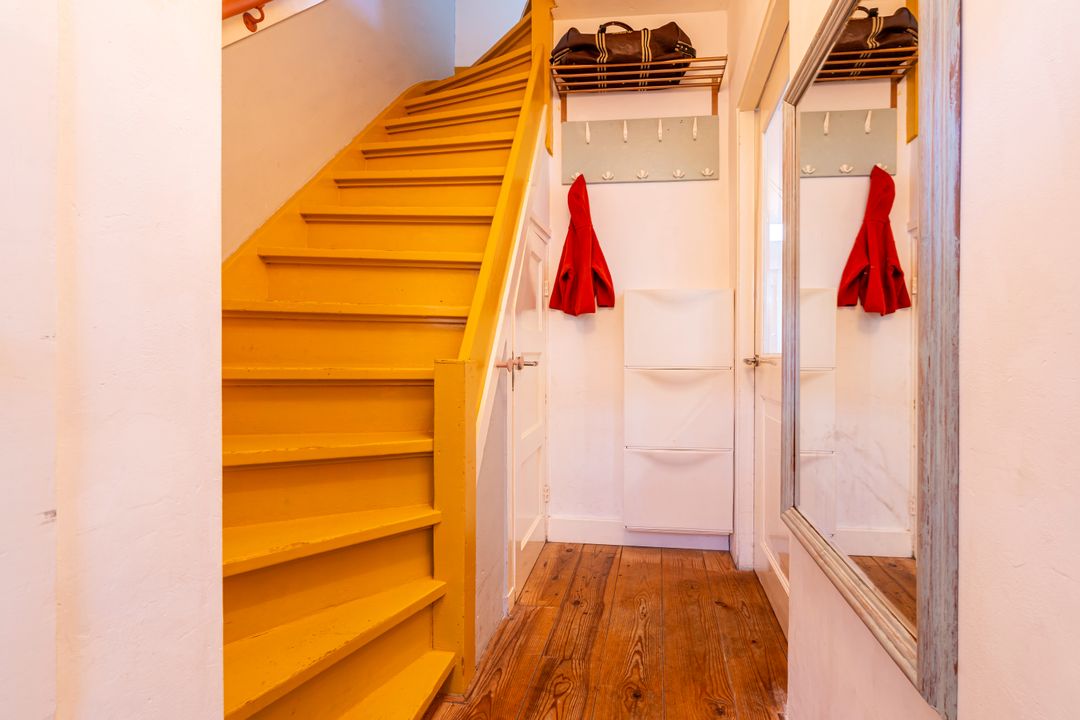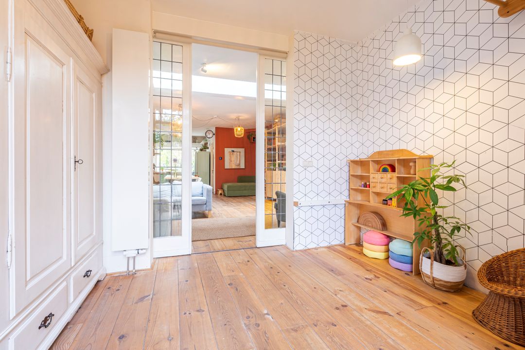 De gang achter de entreedeur geeft direct al de sfeer van een gezellig huis. De deuren voor de provisiekast en richting de woonkamer hebben die kenmerkende panelen. Het toilet is modern, in 2011 gemaakt. Eyecatchers in de woonkamer zijn o.a. de massief grenenhouten vloer, het daglicht wat door de lichtstraat schijnt boven de living en de prachtige glas in lood kamer-en-suite deuren.