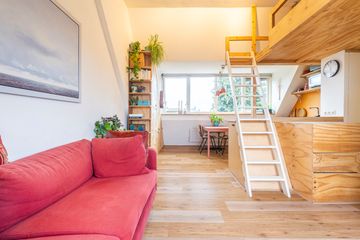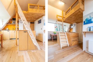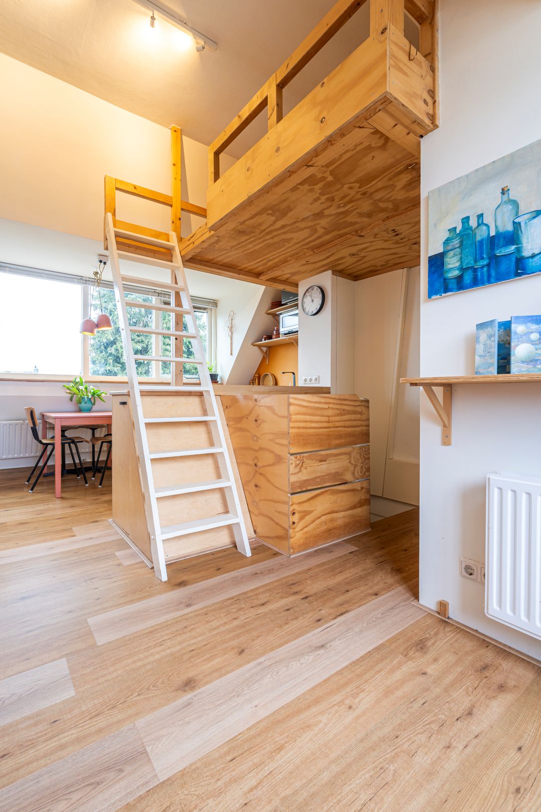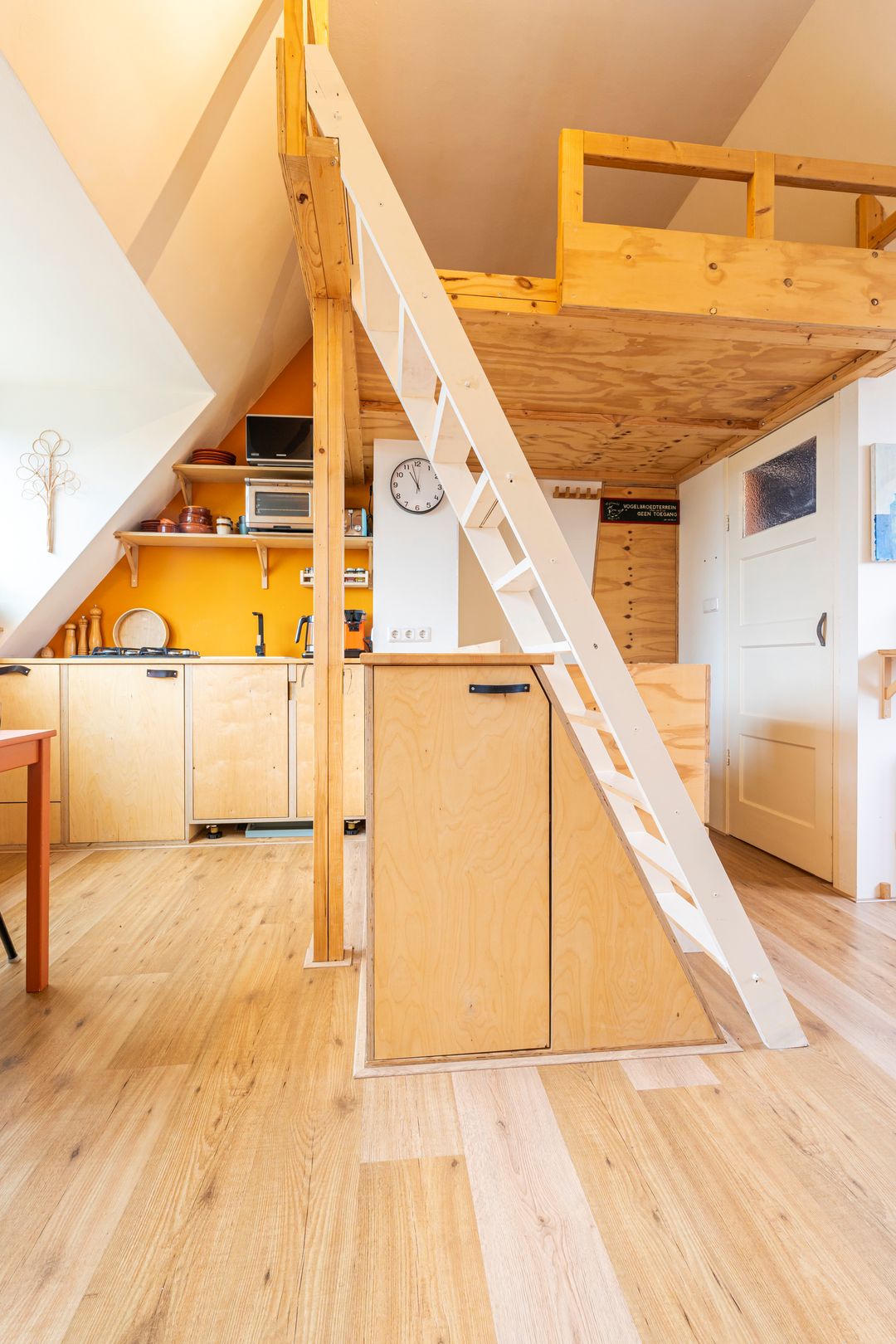 Deze zolderverdieping is ingericht als een self supporting appartement. Een verdieping met een living, een complete keuken, een slaapvide en een volwaardige badkamer voorzien van bad, wastafel en toilet. Diegene die hier gaat wonen heeft de beschikking over een heerlijk licht en sfeervol ingericht tiny house.