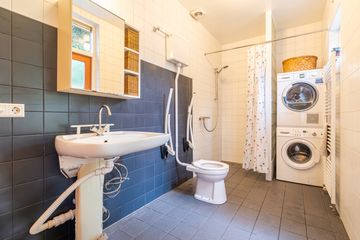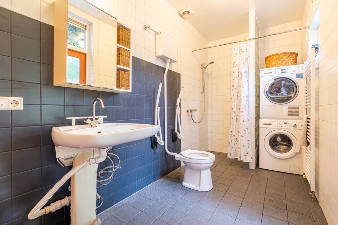 De grote badkamer bevindt zich ook op de begane grond en is op bijzondere wijze toegankelijk gemaakt vanuit de kamer en suite, maar ook via een gangkast als doorgang vanuit de woonkamer. Handig voor gasten die eventueel in de kamer en suite zijn blijven logeren. In de badkamer bevindt zich een douche, wastafel, toilet en wasmachineaansluiting. Op de vloer ligt elektrische vloerverwarming met een eigen thermostaat. De grote openslaande deuren richting de tuin maken het plaatje van de begane grond compleet.
