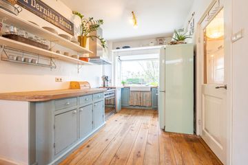 Aan de voorzijde van het huis bevindt zich de landelijk keuken voorzien van inbouwapparatuur en twee maatwerk gebouwde kasten. Het keukenblad is van eikenhout.