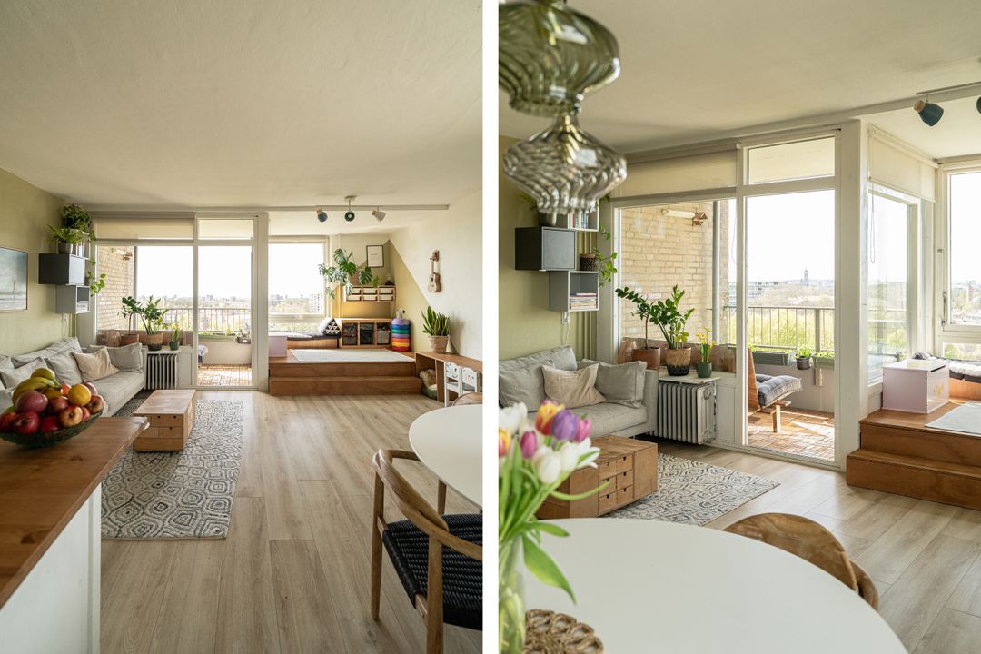 Extra leuk detail is dat in de hoek van de woonkamer is een speelse verhoging is gecreëerd. Perfect als knusse werkplek, speelhoek voor de kinderen of een ontspannen chill-plek. Hieronder zit ook een uitschuif bed, handig als er gasten blijven slapen.