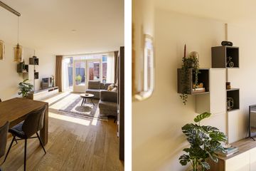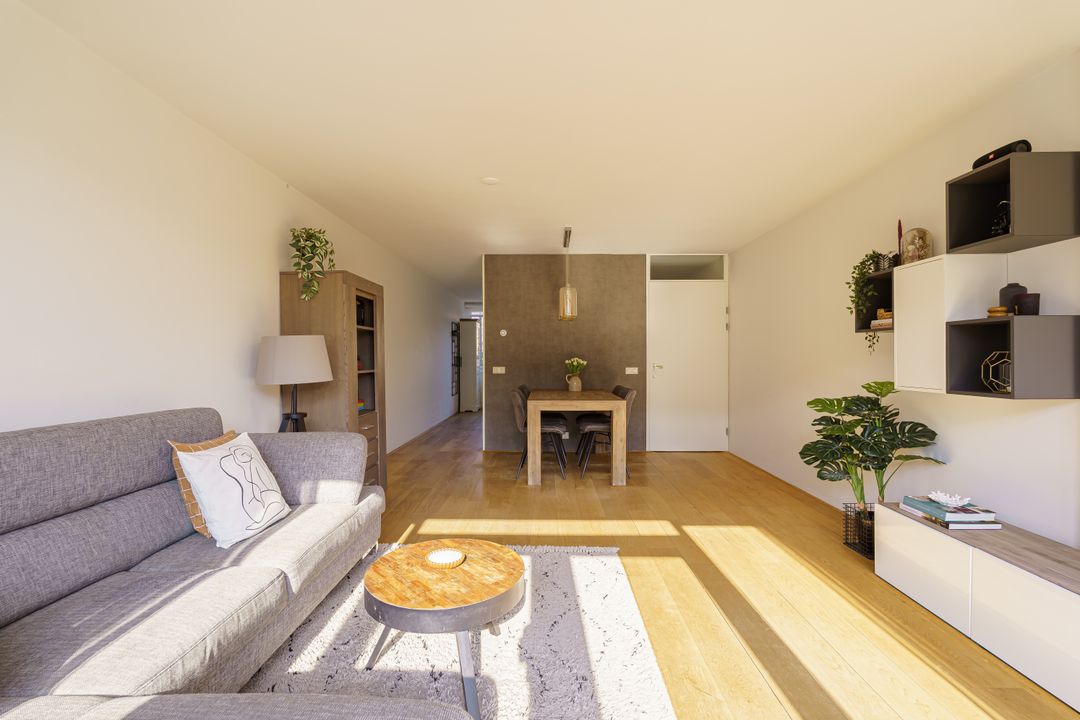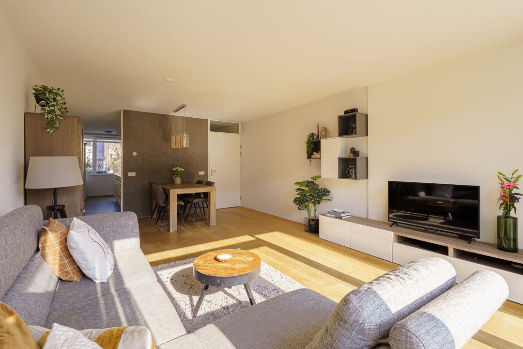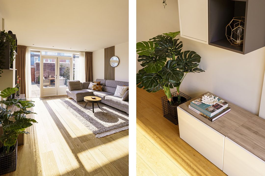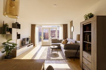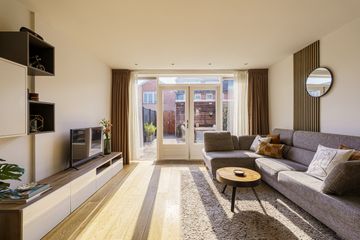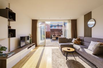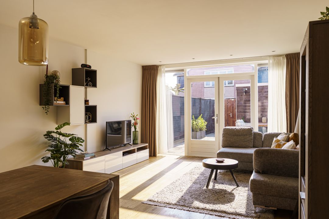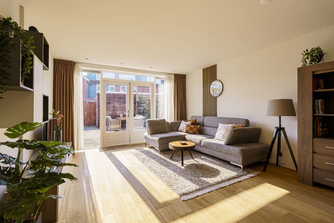 Via de beschutte voortuin met een border met bloeiende planten kom je binnen in de hal met toilet. Zodra je binnenstapt in de woonkamer valt meteen de warme en uitnodigende sfeer op. Dankzij de grote ramen is er veel lichtinval, waardoor de woning prettig en ruim aanvoelt. De uitgebouwde woonkamer ligt aan de tuinzijde en biedt volop ruimte voor zowel een royale eethoek als een comfortabele zithoek. Het is een fijne plek waar het gezin samenkomt, waar je uitgebreid kunt tafelen en waar je via de dubbele deuren gemakkelijk de achtertuin in loopt. De tuin beschikt over een praktische schuur en een achterom, ideaal voor fietsen, speelgoed of tuinspullen.