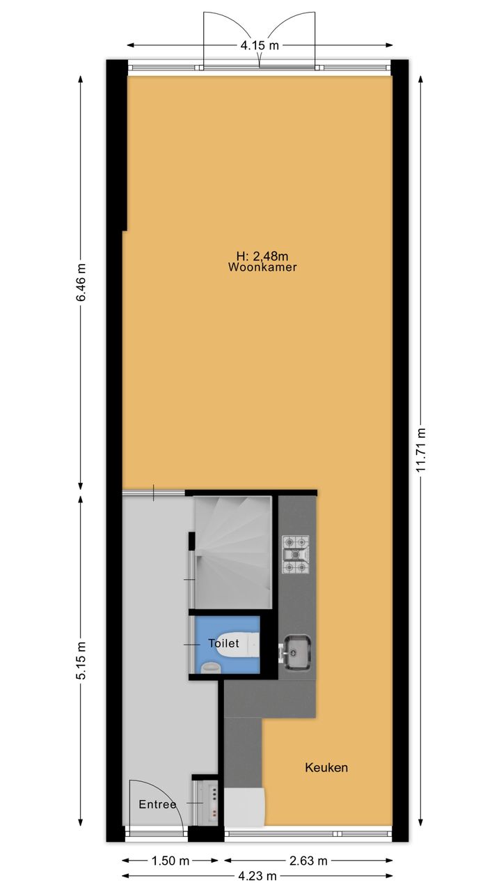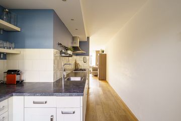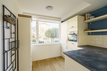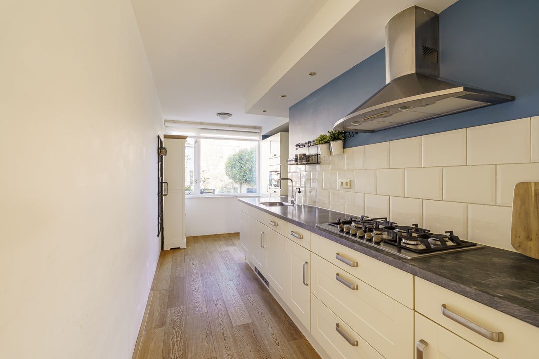 Aan de voorzijde van de woning is de open keuken. Deze is voorzien van diverse inbouwapparatuur, waaronder een 5-pits gaskookstel, afzuigkap, vaatwasser, koelkast, vriezer en oven. Tijdens het koken kijk je hier prettig uit richting het rustige hofje.