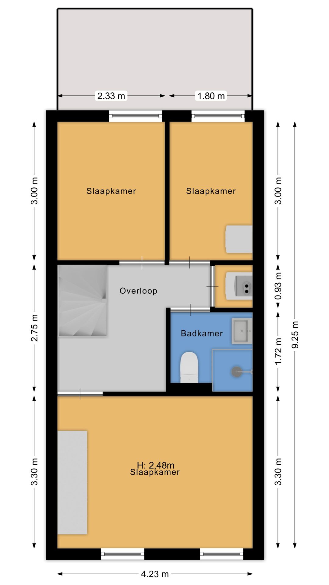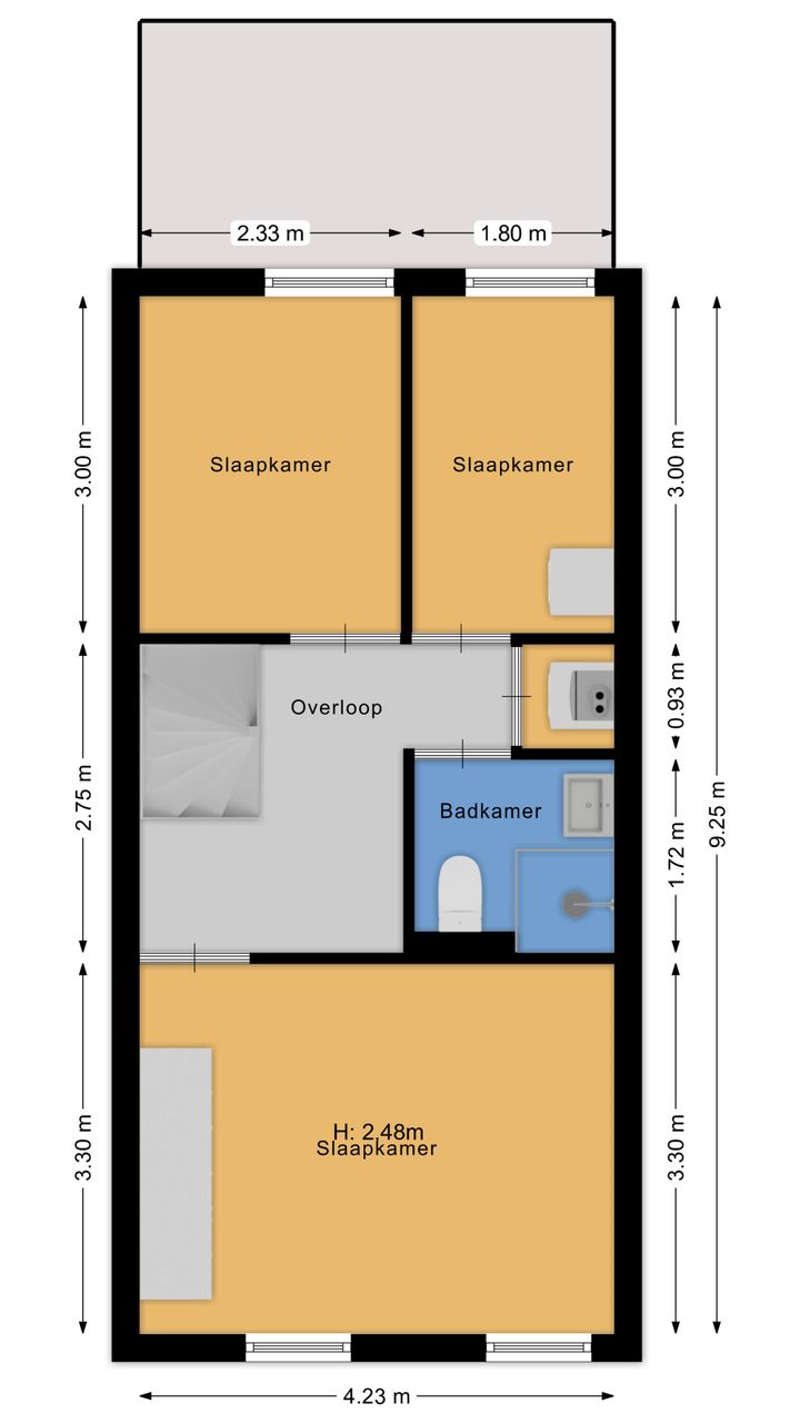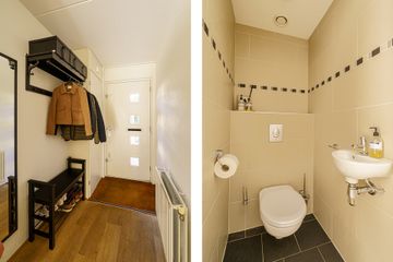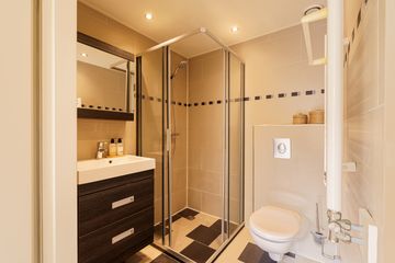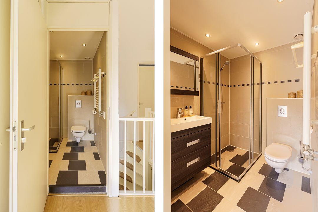Op de eerste verdieping kom je via de overloop bij twee slaapkamers aan de achterzijde, en de ruimere slaapkamer aan de voorzijde. Daarnaast is er een moderne, compacte badkamer met douche, wastafel en toilet. Op de overloop bevindt zich ook een kast met de cv-opstelling en aansluiting voor de wasmachine.