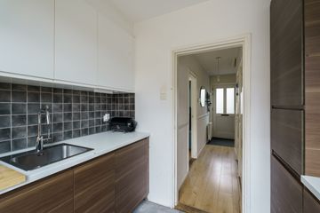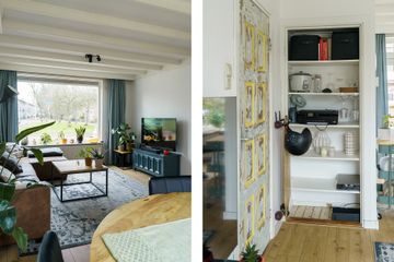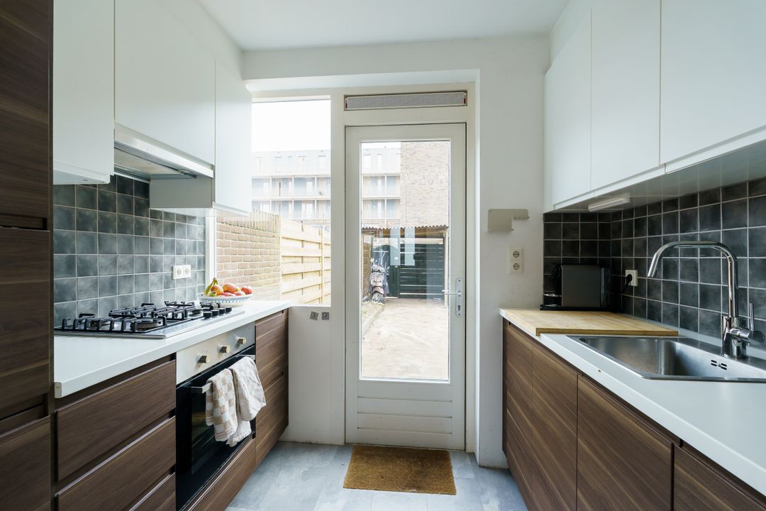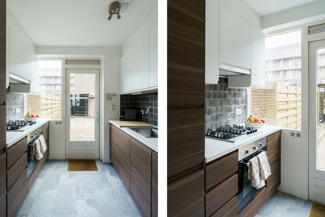 De gesloten keuken is aan de achterzijde en heeft een moderne uitstraling dankzij de warme walnootkleur in combinatie met frisse witte bovenkasten. Uiteraard is de keuken van alle gemakken voorzien: kookplaat, oven, koelkast, vriezer en vaatwasser. Ook vanuit hier heb je toegang tot de tuin.