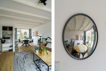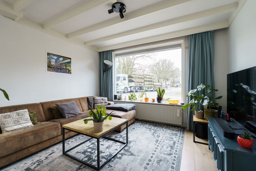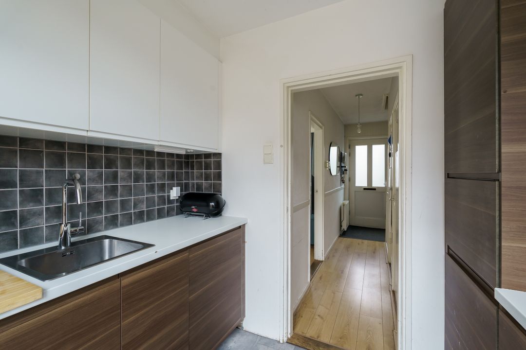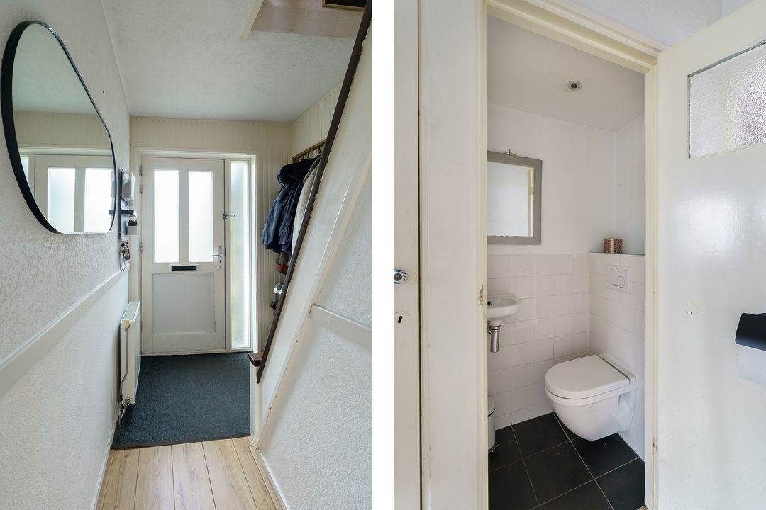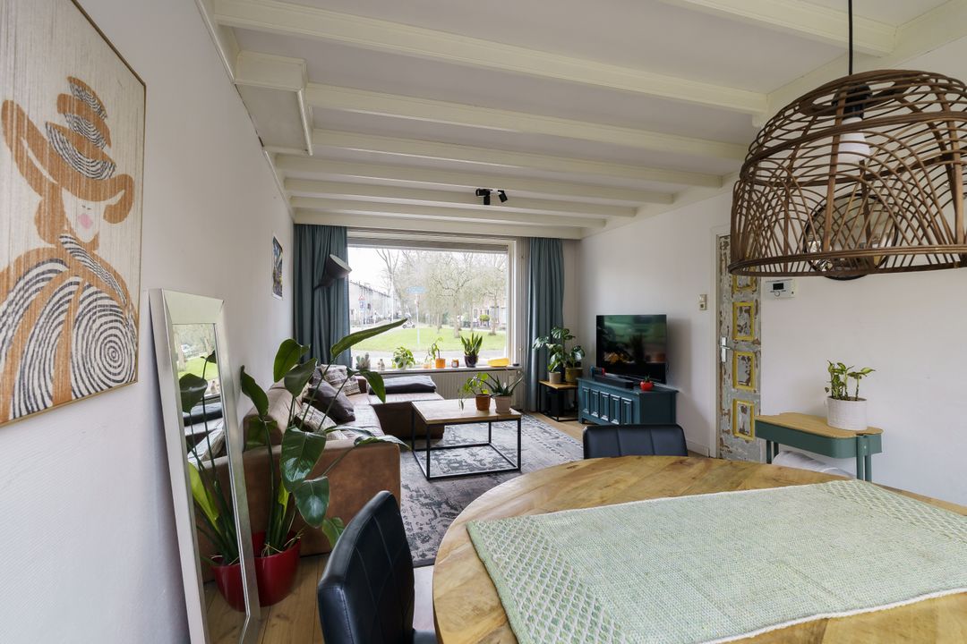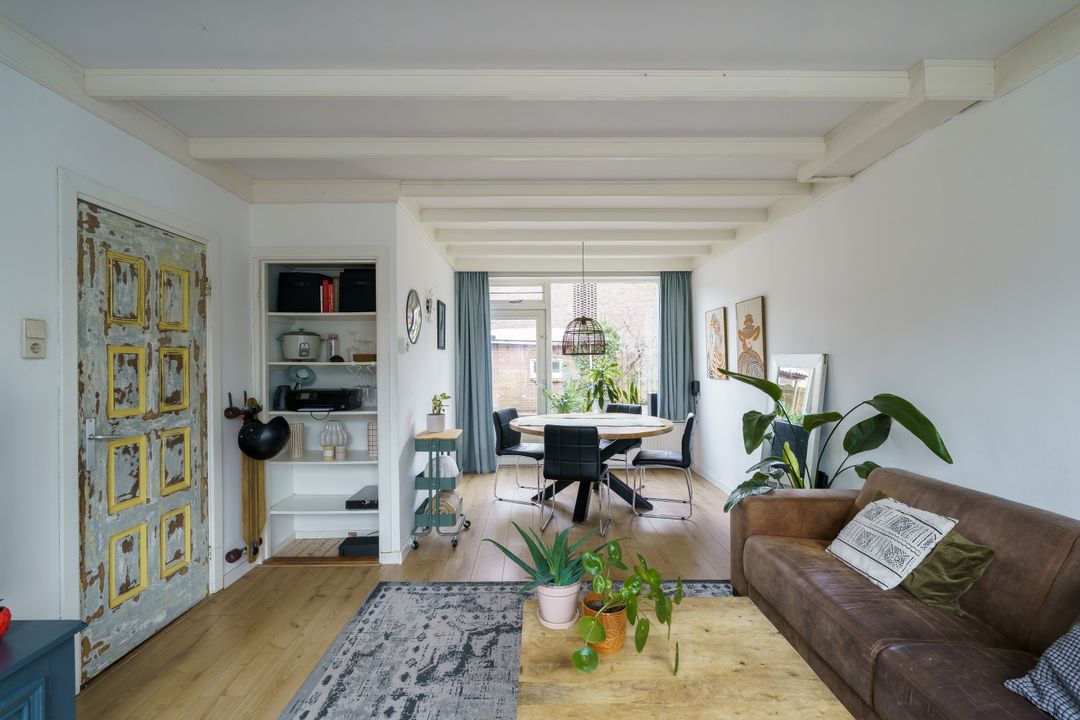 Je komt binnen via fijne lichte hal met toilet en trapopgang. De doorzonwoonkamer is lekker licht en voelt ruim aan. Het grote raam aan de voorzijde biedt vrij uitzicht over het plantsoen aan de overzijde, terwijl je aan de achterzijde zo de tuin in loopt. Er is genoeg plek voor een comfortabele zithoek en een gezellige eettafel.