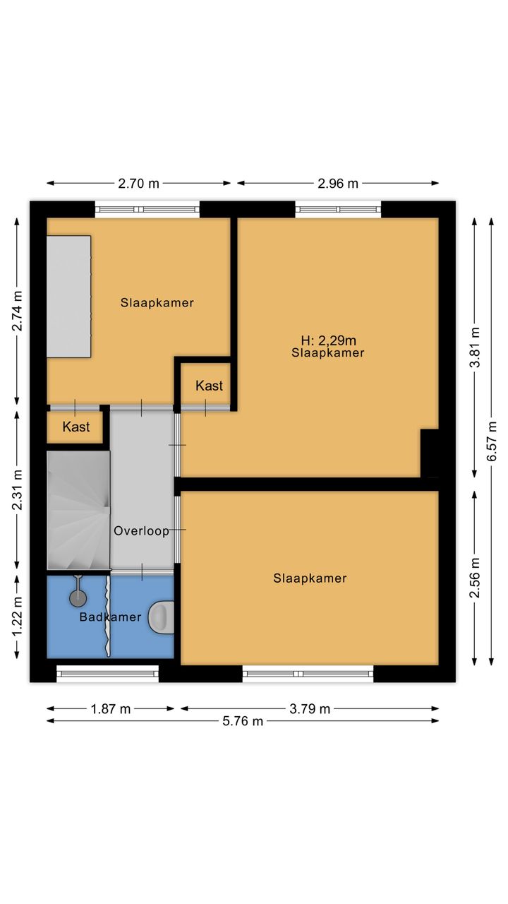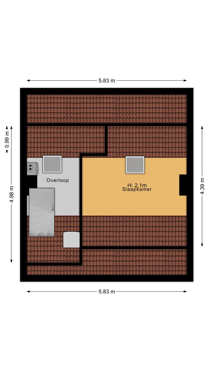De tweede verdieping bereik je via een vaste trap en op de overloop is een wasmachineaansluiting en de cv-opstelling. Hier is ook de vierde slaapkamer met dakraam. Let op! Deze verdieping hebben wij meegenomen in de woonoppervlakte. Officieel moet dit worden aangemerkt als “overig inpandig” (circa 12,3 m²), aangezien het net niet voldoet aan de eisen voor woonoppervlak. Een dakkapel zorgt ervoor dat het wel als woonoppervlak gezien wordt, maar ook zonder aanpassingen is deze zolder prima als slaap- of werkkamer te gebruiken. En dankzij de gunstige ligging kun je aan de voorzijde van het dak tot wel 8 zonnepanelen plaatsen.